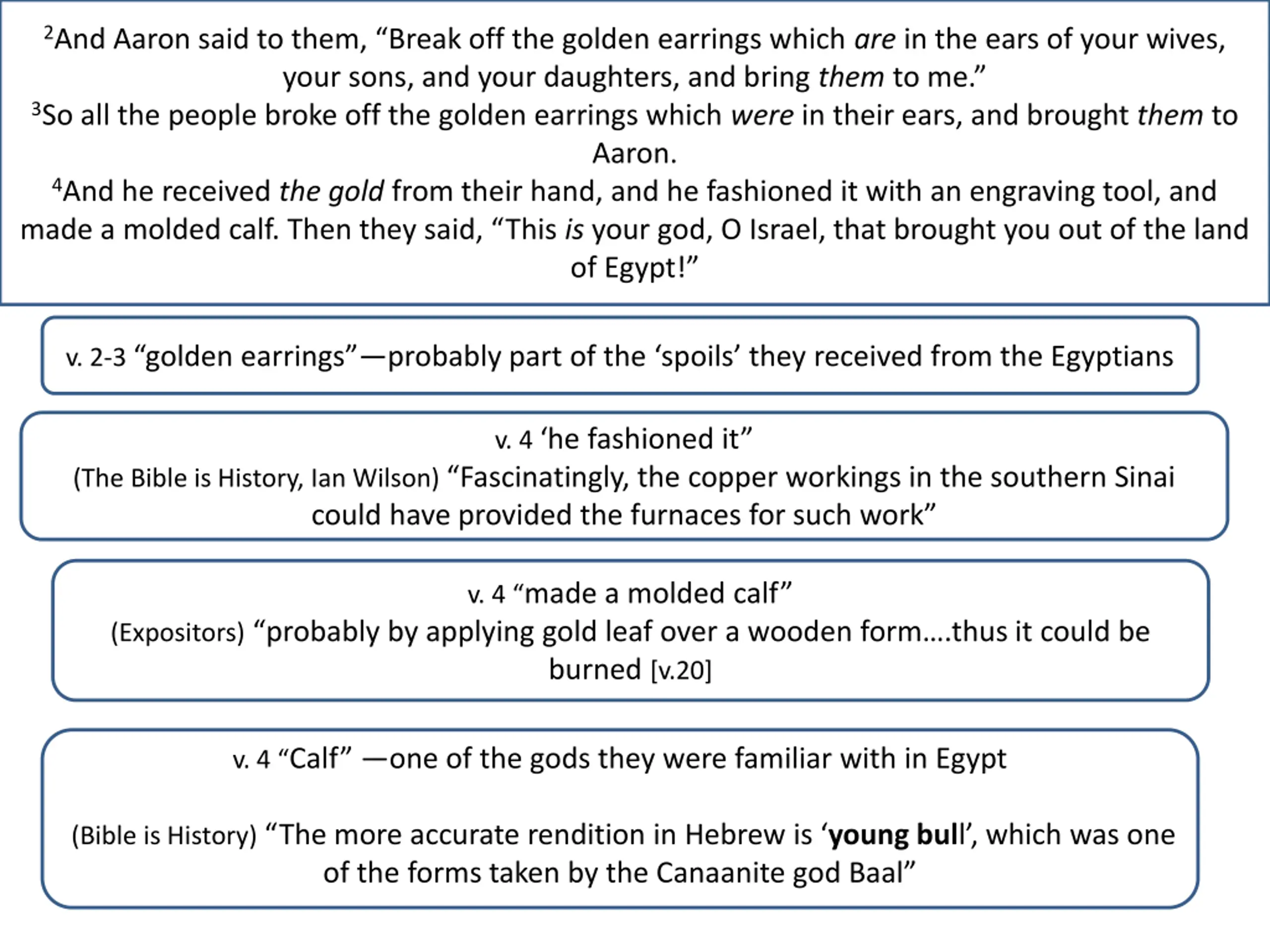2And Aaron said to them, Break off the golden earrings which are in the ears of your wives, your sons, and your daughters, and bring themto me. 3So all the people broke off the golden earrings which were in their ears, and brought them to Aaron. 4And he received the gold from their hand, and he fashioned it with an engraving tool, and made a molded calf. Then they said, This is your god, O Israel, that brought you out of the land of Egypt! v. 2-3 golden earrings probably part of the spoils they received from the Egyptians v. 4 he fashioned it (The Bible is History, Ian Wilson) Fascinatingly, the copper workings in the southern Sinai could have provided the furnaces for such work v. 4 made a molded calf (Expositors) probably by applying gold leaf over a wooden form .thus it could be burned [v.20] v. 4 Calf one of the gods they were familiar with in Egypt (Bible is History) The more accurate rendition in Hebrew is young bull , which was one of the forms taken by the Canaanite god Baal