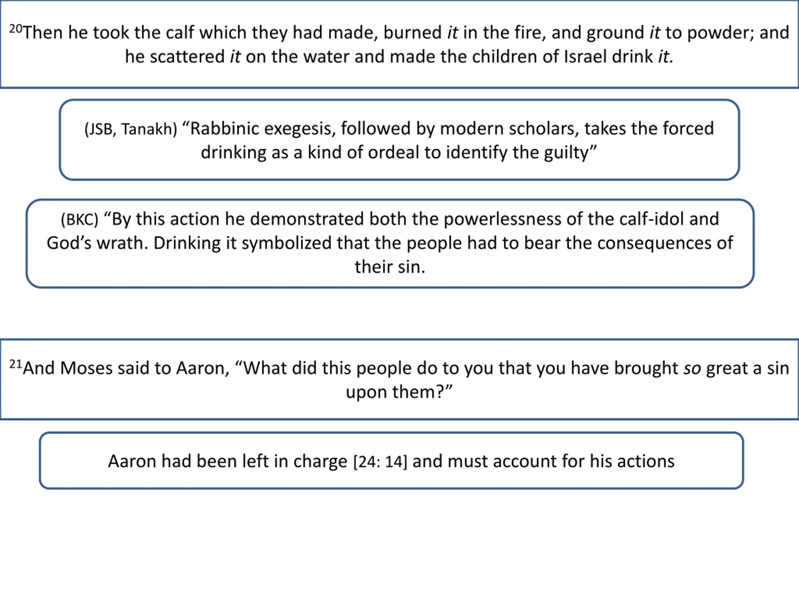 20Then he took the calf which they had made, burned it in the fire, and ground it to powder; and he scattered it on the water and made the children of Israel drink it. (JSB, Tanakh) Rabbinic exegesis, followed by modern scholars, takes the forced drinking as a kind of ordeal to identify the guilty (BKC) By this action he demonstrated both the powerlessness of the calf-idol and God s wrath. Drinking it symbolized that the people had to bear the consequences of their sin. 21And Moses said to Aaron, What did this people do to you that you have brought so great a sin upon them? Aaron had been left in charge [24: 14] and must account for his actions