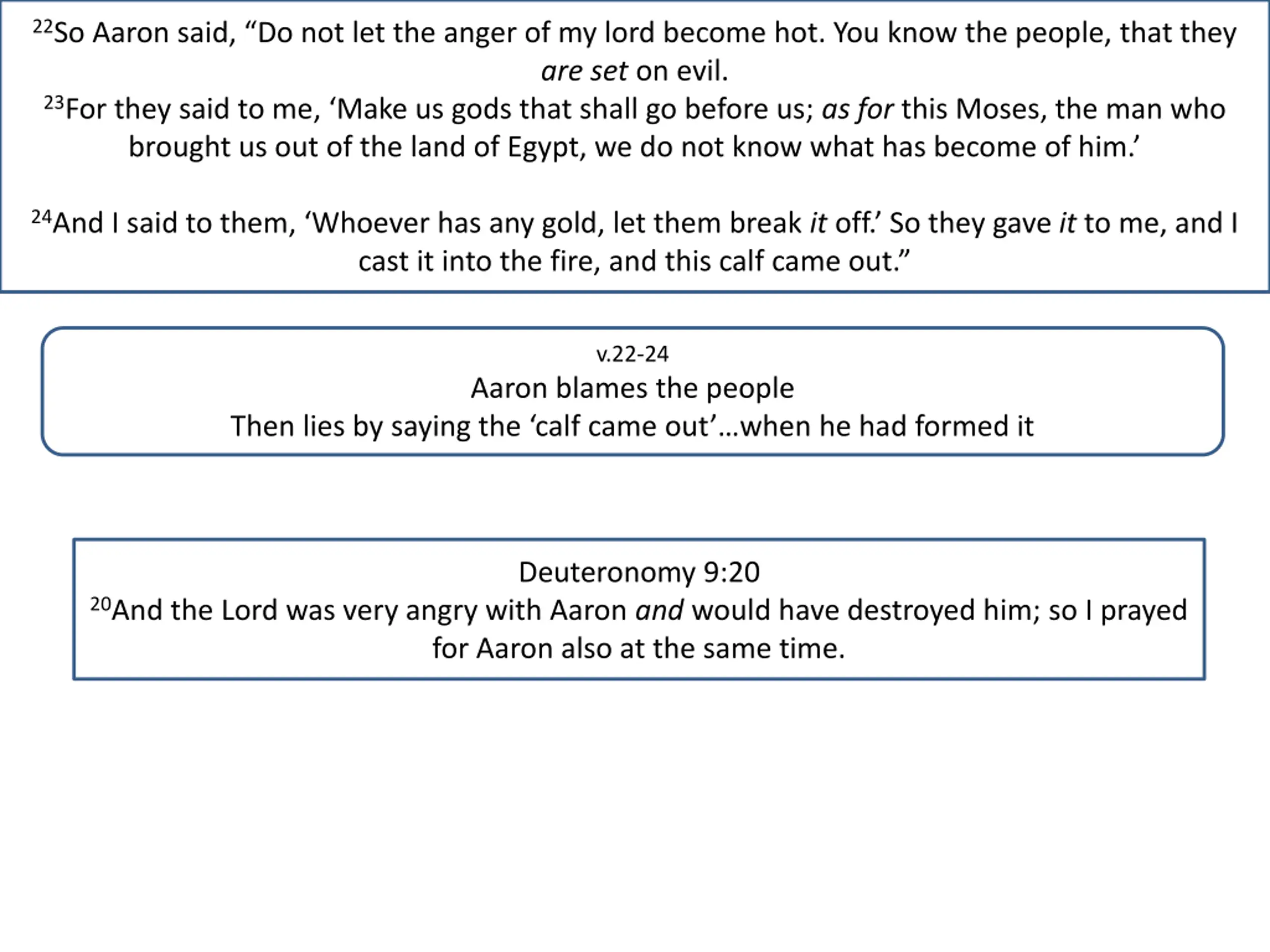 22So Aaron said, Do not let the anger of my lord become hot. You know the people, that they are set on evil. 23For they said to me, Make us gods that shall go before us; as for this Moses, the man who brought us out of the land of Egypt, we do not know what has become of him. 24And I said to them, Whoever has any gold, let them break itoff. So they gave it to me, and I cast it into the fire, and this calf came out. v.22-24 Aaron blames the people Then lies by saying the calf came out when he had formed it Deuteronomy 9:20 20And the Lord was very angry with Aaron and would have destroyed him; so I prayed for Aaron also at the same time.
