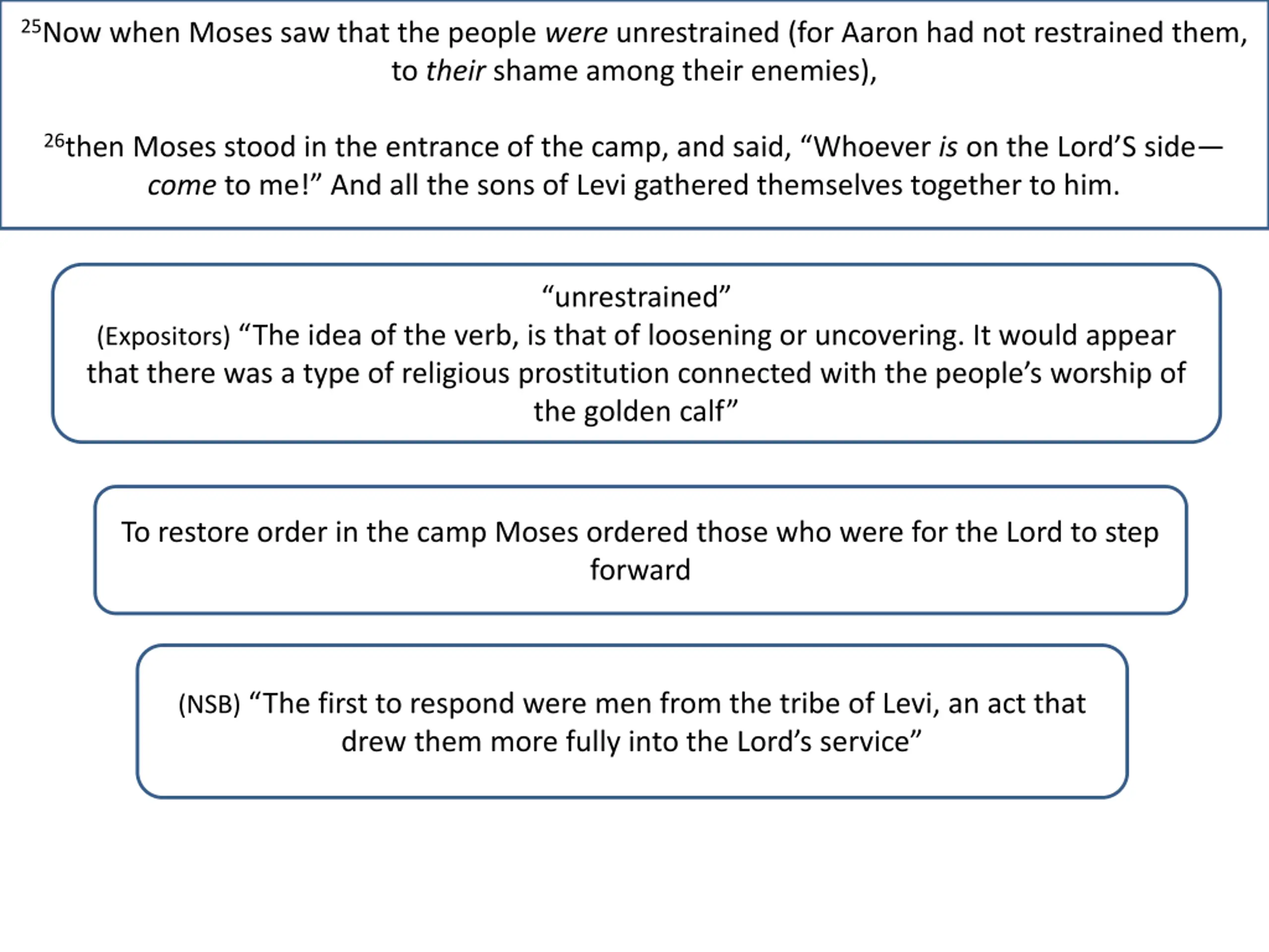 25Now when Moses saw that the people were unrestrained (for Aaron had not restrained them, to their shame among their enemies), 26then Moses stood in the entrance of the camp, and said, Whoever ison the Lord S side cometo me! And all the sons of Levi gathered themselves together to him. unrestrained (Expositors) The idea of the verb, is that of loosening or uncovering. It would appear that there was a type of religious prostitution connected with the people s worship of the golden calf To restore order in the camp Moses ordered those who were for the Lord to step forward (NSB) The first to respond were men from the tribe of Levi, an act that drew them more fully into the Lord s service