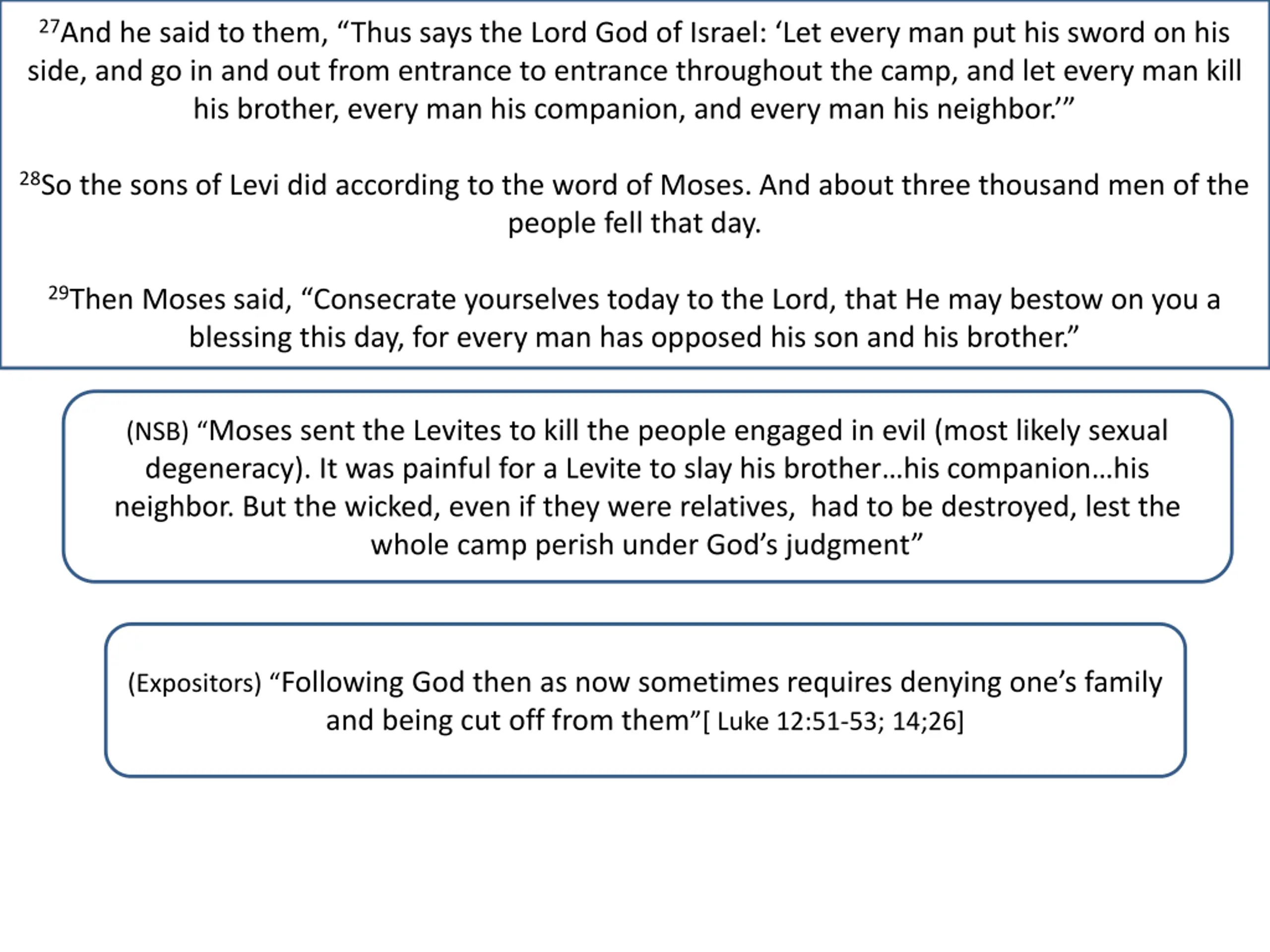 27And he said to them, Thus says the Lord God of Israel: Let every man put his sword on his side, and go in and out from entrance to entrance throughout the camp, and let every man kill his brother, every man his companion, and every man his neighbor. 28So the sons of Levi did according to the word of Moses. And about three thousand men of the people fell that day. 29Then Moses said, Consecrate yourselves today to the Lord, that He may bestow on you a blessing this day, for every man has opposed his son and his brother. (NSB) Moses sent the Levites to kill the people engaged in evil (most likely sexual degeneracy). It was painful for a Levite to slay his brother his companion his neighbor. But the wicked, even if they were relatives, had to be destroyed, lest the whole camp perish under God s judgment (Expositors) Following God then as now sometimes requires denying one s family and being cut off from them [ Luke 12:51-53; 14;26]