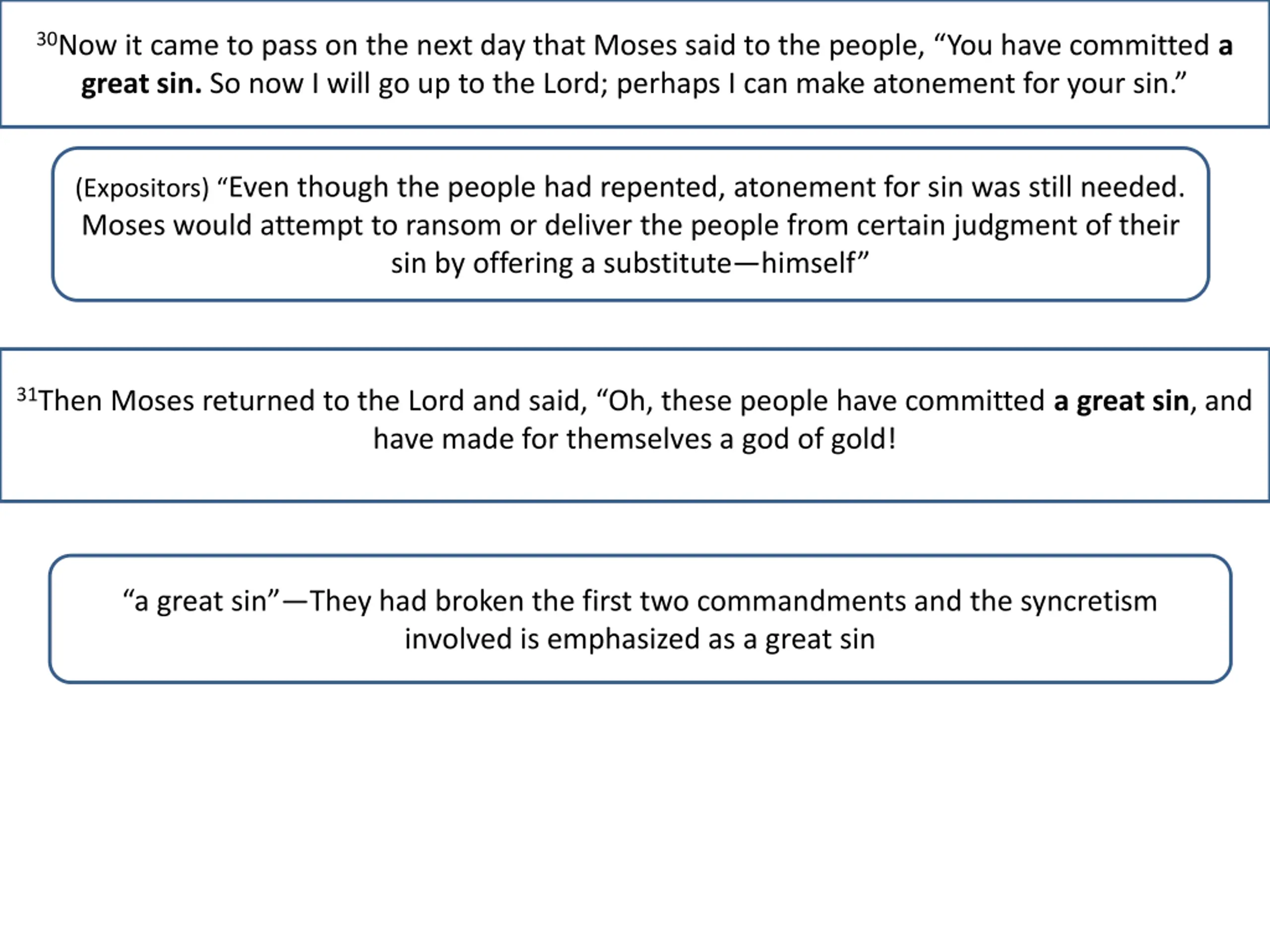 30Now it came to pass on the next day that Moses said to the people, You have committed a great sin.So now I will go up to the Lord; perhaps I can make atonement for your sin. (Expositors) Even though the people had repented, atonement for sin was still needed. Moses would attempt to ransom or deliver the people from certain judgment of their sin by offering a substitute himself 31Then Moses returned to the Lord and said, Oh, these people have committed a great sin, and have made for themselves a god of gold! a great sin They had broken the first two commandments and the syncretism involved is emphasized as a great sin