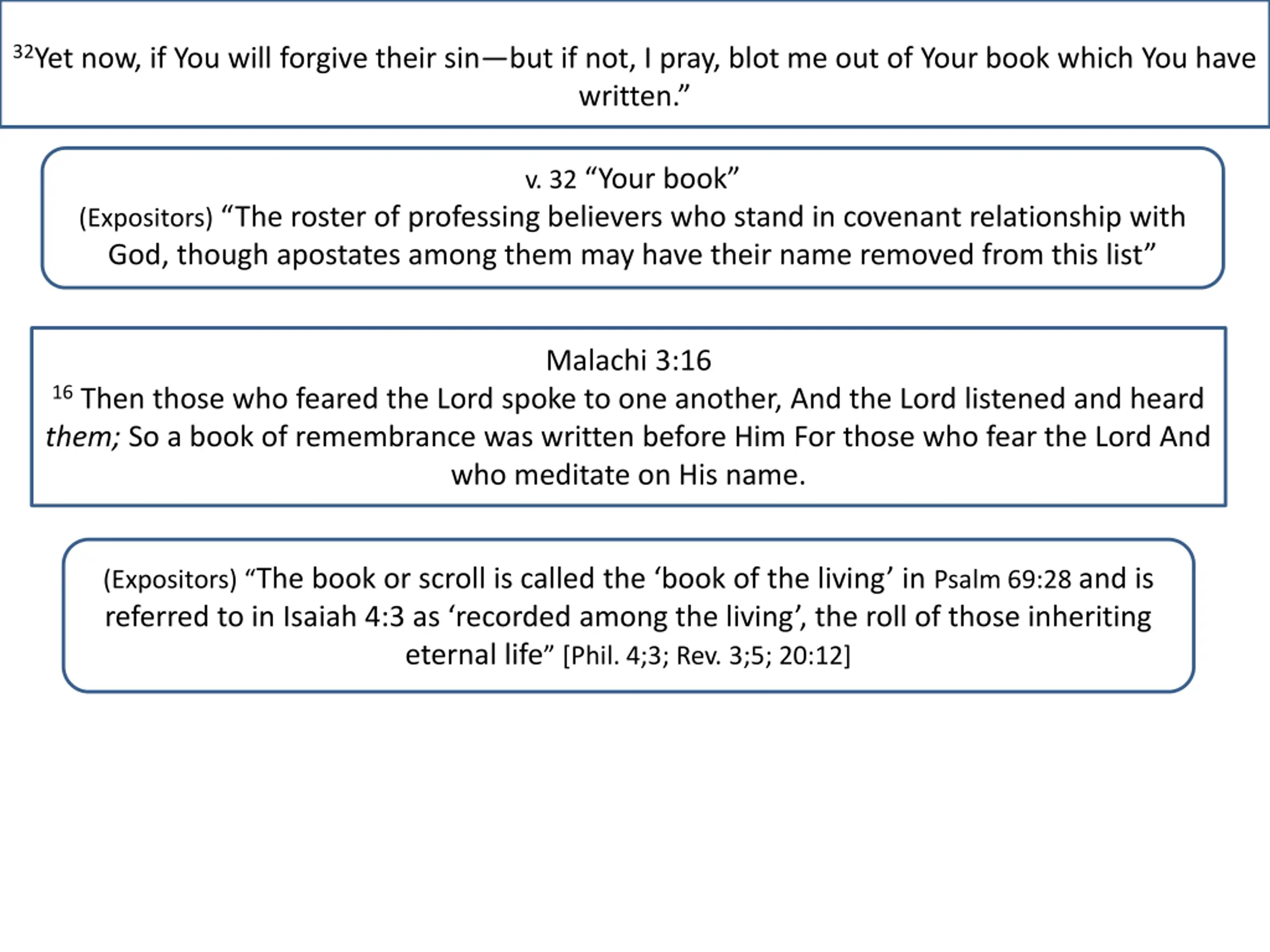 32Yet now, if You will forgive their sinbut if not, I pray, blot me out of Your book which You have written. v. 32 Your book (Expositors) The roster of professing believers who stand in covenant relationship with God, though apostates among them may have their name removed from this list Malachi 3:16 16 Then those who feared the Lord spoke to one another, And the Lord listened and heard them; So a book of remembrance was written before Him For those who fear the Lord And who meditate on His name. (Expositors) The book or scroll is called the book of the living in Psalm 69:28 and is referred to in Isaiah 4:3 as recorded among the living , the roll of those inheriting eternal life [Phil. 4;3; Rev. 3;5; 20:12]