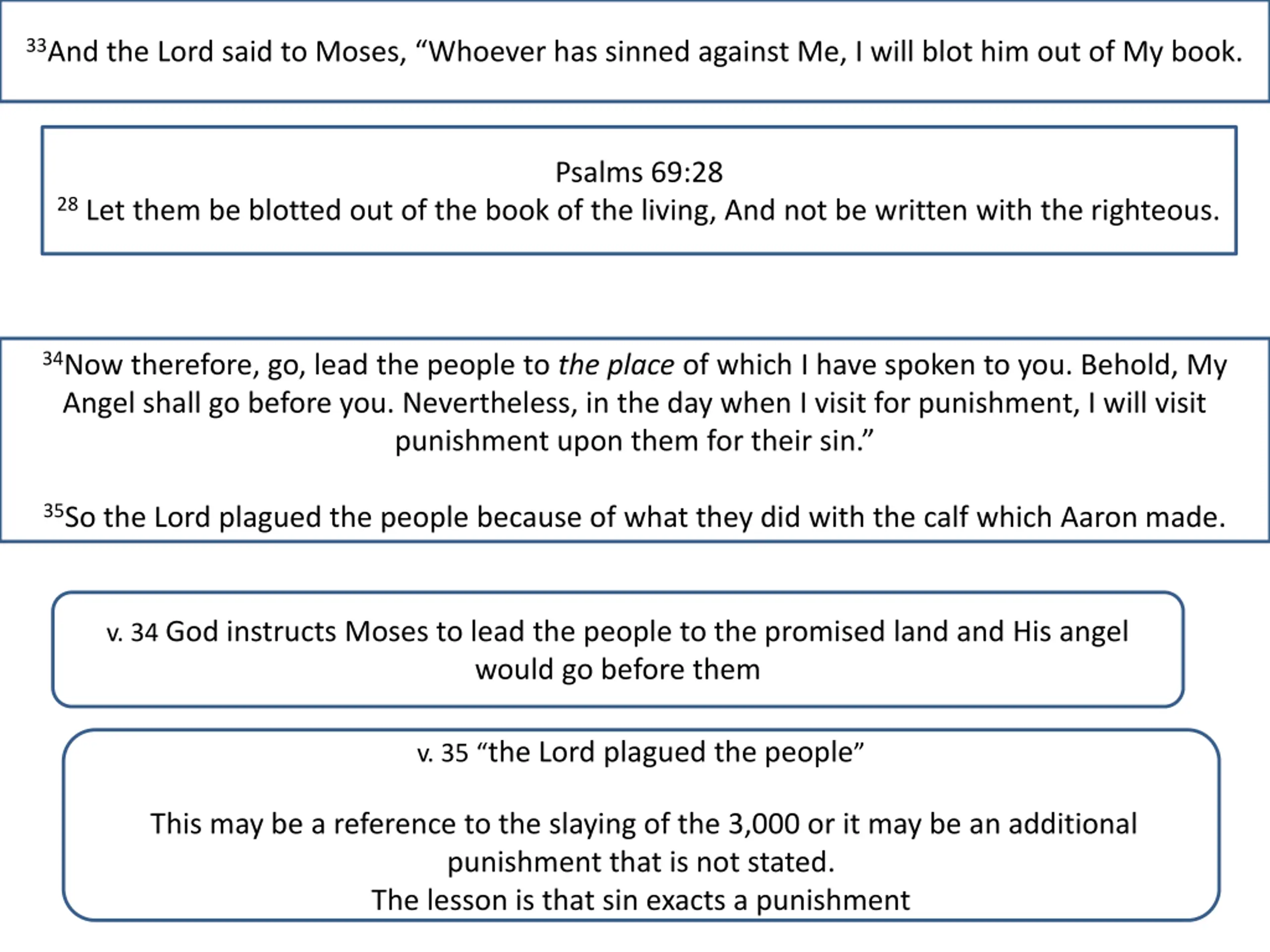 33And the Lord said to Moses, Whoever has sinned against Me, I will blot him out of My book. Psalms 69:28 28 Let them be blotted out of the book of the living, And not be written with the righteous. 34Now therefore, go, lead the people to the place of which I have spoken to you. Behold, My Angel shall go before you. Nevertheless, in the day when I visit for punishment, I will visit punishment upon them for their sin. 35So the Lord plagued the people because of what they did with the calf which Aaron made. v. 34 God instructs Moses to lead the people to the promised land and His angel would go before them v. 35 the Lord plagued the people This may be a reference to the slaying of the 3,000 or it may be an additional punishment that is not stated. The lesson is that sin exacts a punishment