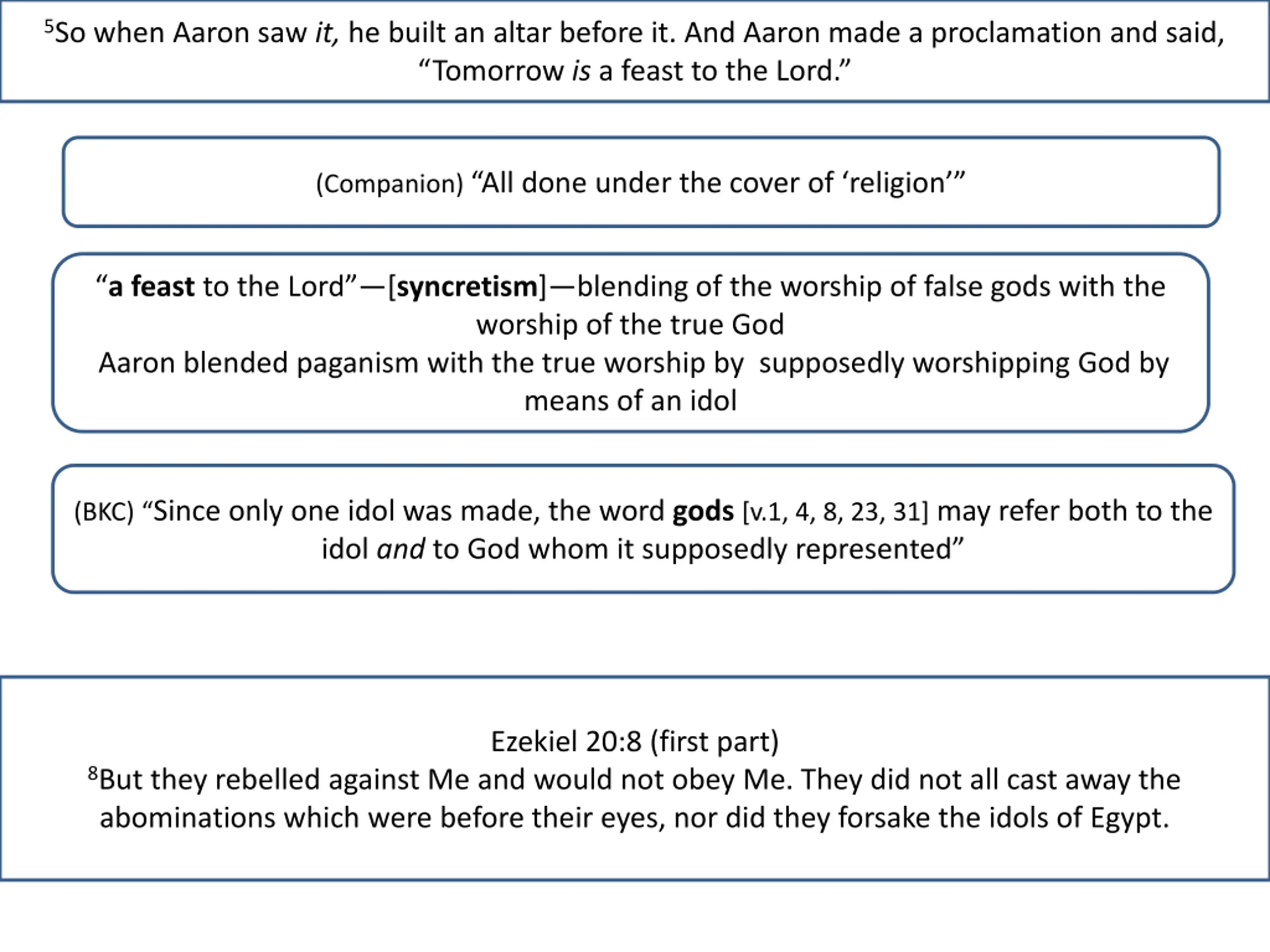 5So when Aaron saw it, he built an altar before it. And Aaron made a proclamation and said, Tomorrow isa feast to the Lord. (Companion) All done under the cover of religion a feast to the Lord [syncretism] blending of the worship of false gods with the worship of the true God Aaron blended paganism with the true worship by supposedly worshipping God by means of an idol (BKC) Since only one idol was made, the word gods[v.1, 4, 8, 23, 31] may refer both to the idol andto God whom it supposedly represented Ezekiel 20:8 (first part) 8But they rebelled against Me and would not obey Me. They did not all cast away the abominations which were before their eyes, nor did they forsake the idols of Egypt.