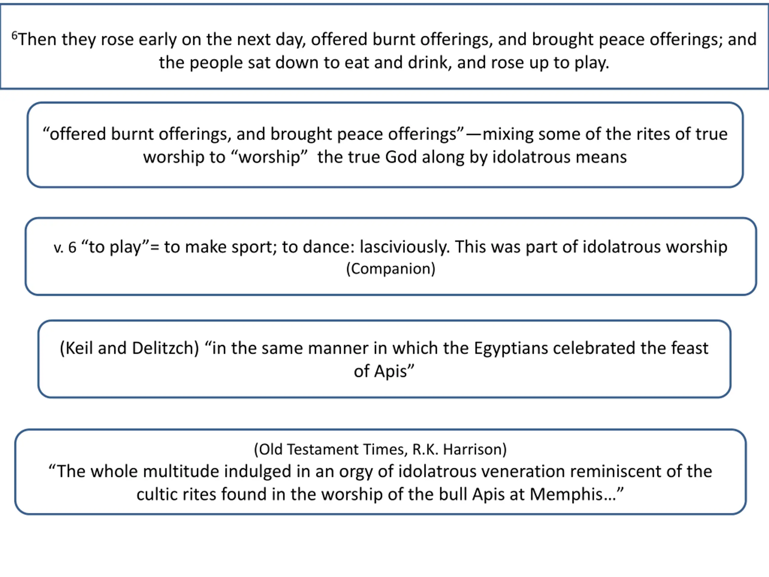 6Then they rose early on the next day, offered burnt offerings, and brought peace offerings; and the people sat down to eat and drink, and rose up to play. offered burnt offerings, and brought peace offerings mixing some of the rites of true worship to worship the true God along by idolatrous means v. 6 to play = to make sport; to dance: lasciviously. This was part of idolatrous worship (Companion) (Keil and Delitzch) in the same manner in which the Egyptians celebrated the feast of Apis (Old Testament Times, R.K. Harrison) The whole multitude indulged in an orgy of idolatrous veneration reminiscent of the cultic rites found in the worship of the bull Apis at Memphis