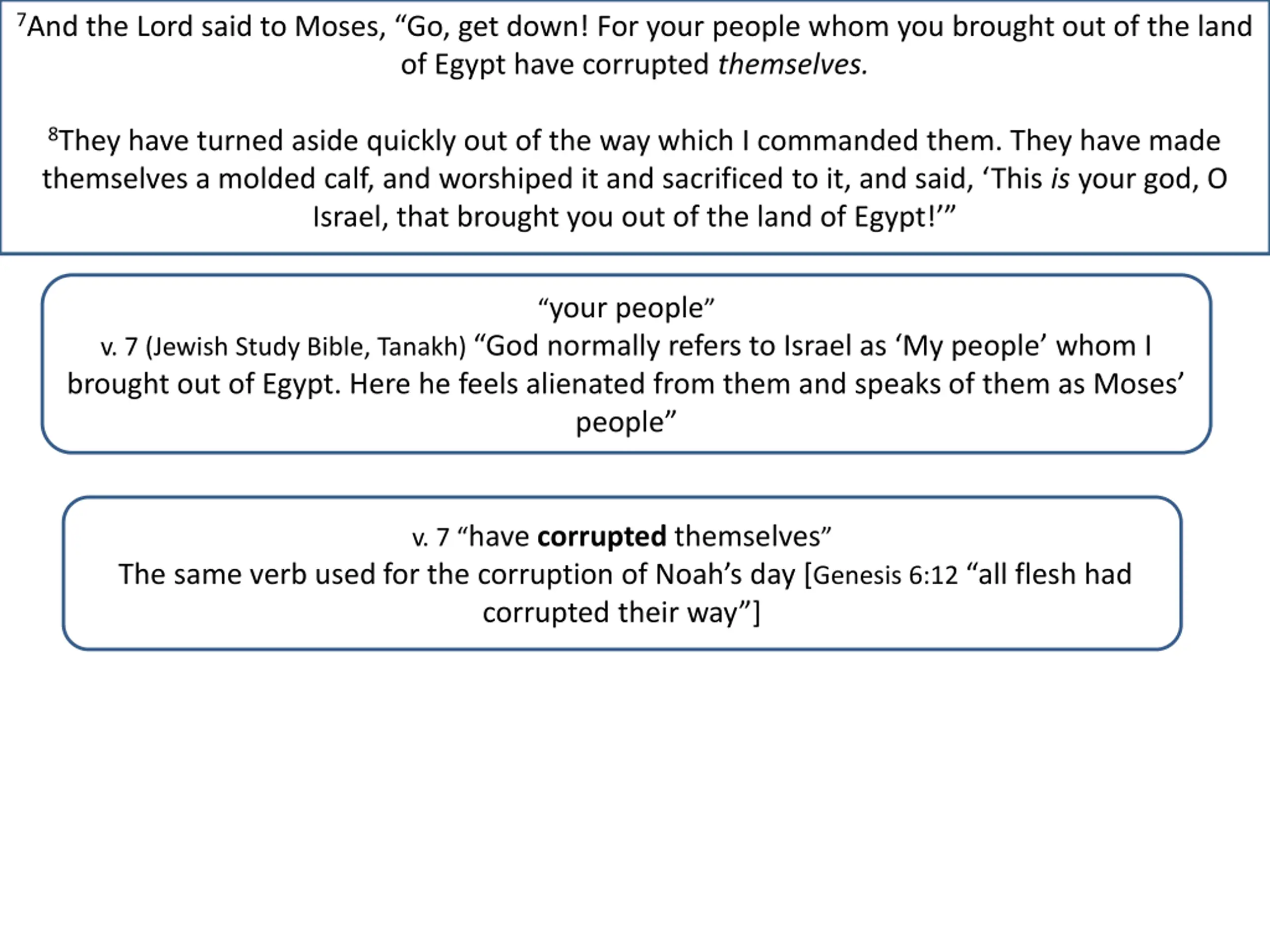 7And the Lord said to Moses, Go, get down! For your people whom you brought out of the land of Egypt have corrupted themselves. 8They have turned aside quickly out of the way which I commanded them. They have made themselves a molded calf, and worshiped it and sacrificed to it, and said, This is your god, O Israel, that brought you out of the land of Egypt! your people v. 7 (Jewish Study Bible, Tanakh) God normally refers to Israel as My people whom I brought out of Egypt. Here he feels alienated from them and speaks of them as Moses people v. 7 have corrupted themselves The same verb usedfor the corruption of Noah s day [Genesis 6:12 all flesh had corrupted their way ]