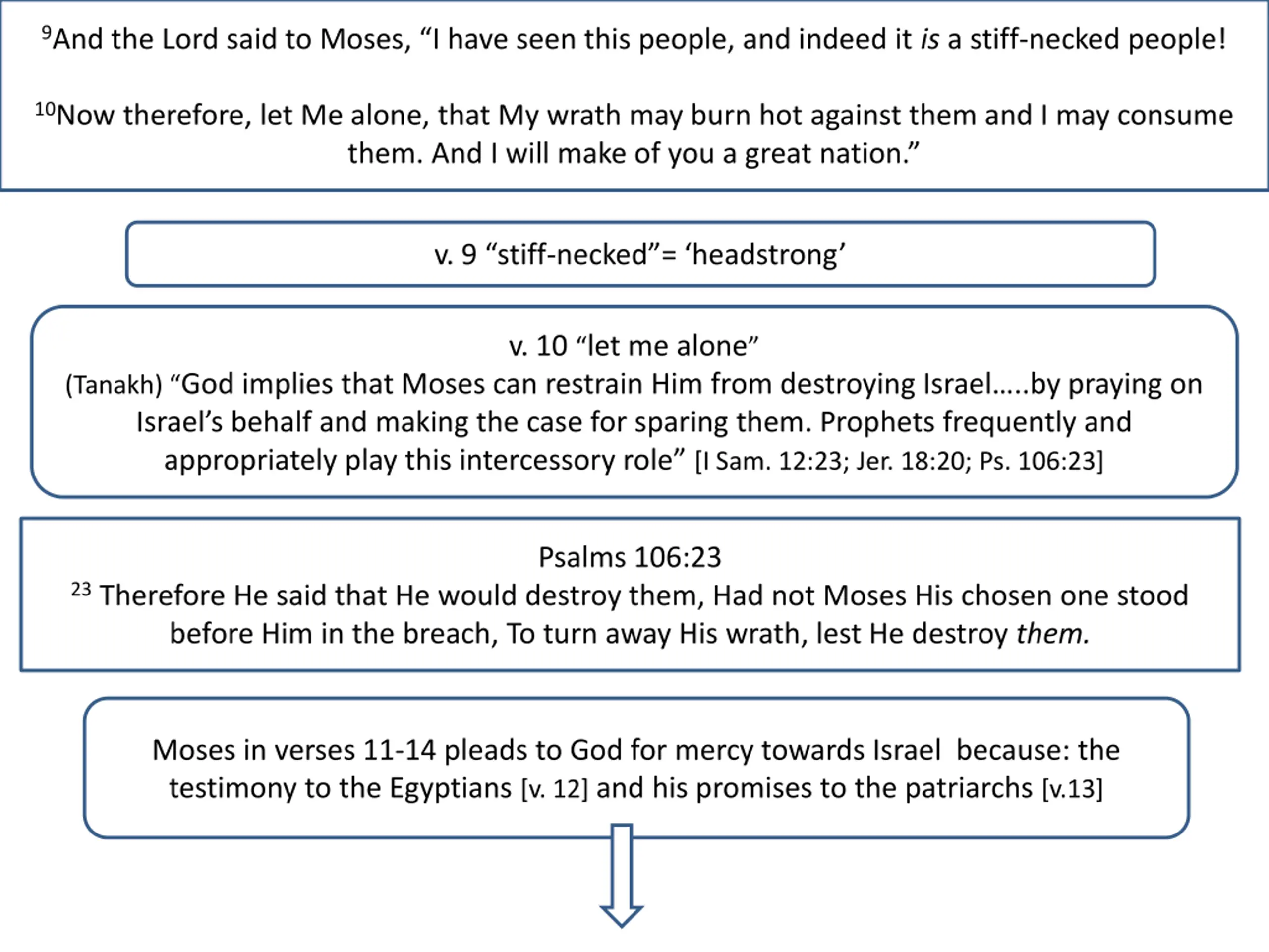 9And the Lord said to Moses, I have seen this people, and indeed it is a stiff-necked people! 10Now therefore, let Me alone, that My wrath may burn hot against them and I may consume them. And I will make of you a great nation. v. 9 stiff-necked = headstrong v. 10 let me alone (Tanakh) God implies that Moses can restrain Him from destroying Israel ..by praying on Israel s behalf and making the case for sparing them. Prophets frequently and appropriately play this intercessory role [I Sam. 12:23; Jer. 18:20; Ps. 106:23] Psalms 106:23 23 Therefore He said that He would destroy them, Had not Moses His chosen one stood before Him in the breach, To turn away His wrath, lest He destroy them. Moses in verses 11-14 pleads to God for mercy towards Israel because: the testimony to the Egyptians [v. 12] and his promises to the patriarchs [v.13]