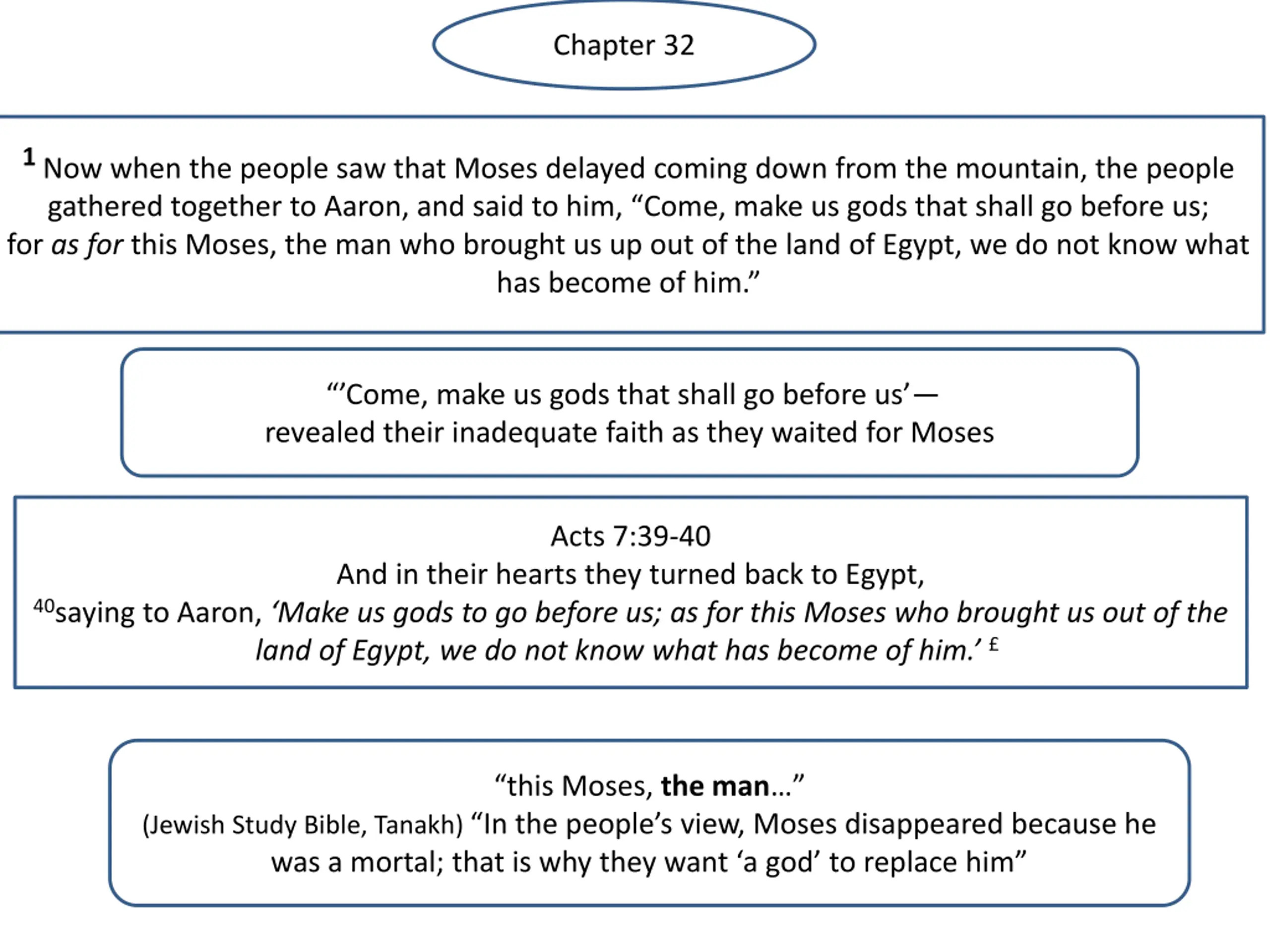Chapter 32 1 Now when the people saw that Moses delayed coming down from the mountain, the people gathered together to Aaron, and said to him, Come, make us gods that shall go before us; for as for this Moses, the man who brought us up out of the land of Egypt, we do not know what has become of him. Come, make us gods that shall go before us revealed their inadequate faith as they waited for Moses Acts 7:39-40 And in their hearts they turned back to Egypt, 40saying to Aaron, Make us gods to go before us; as for this Moses who brought us out of the land of Egypt, we do not know what has become of him. this Moses, the man (Jewish Study Bible, Tanakh) In the people s view, Moses disappeared because he was a mortal; that is why they want a god to replace him