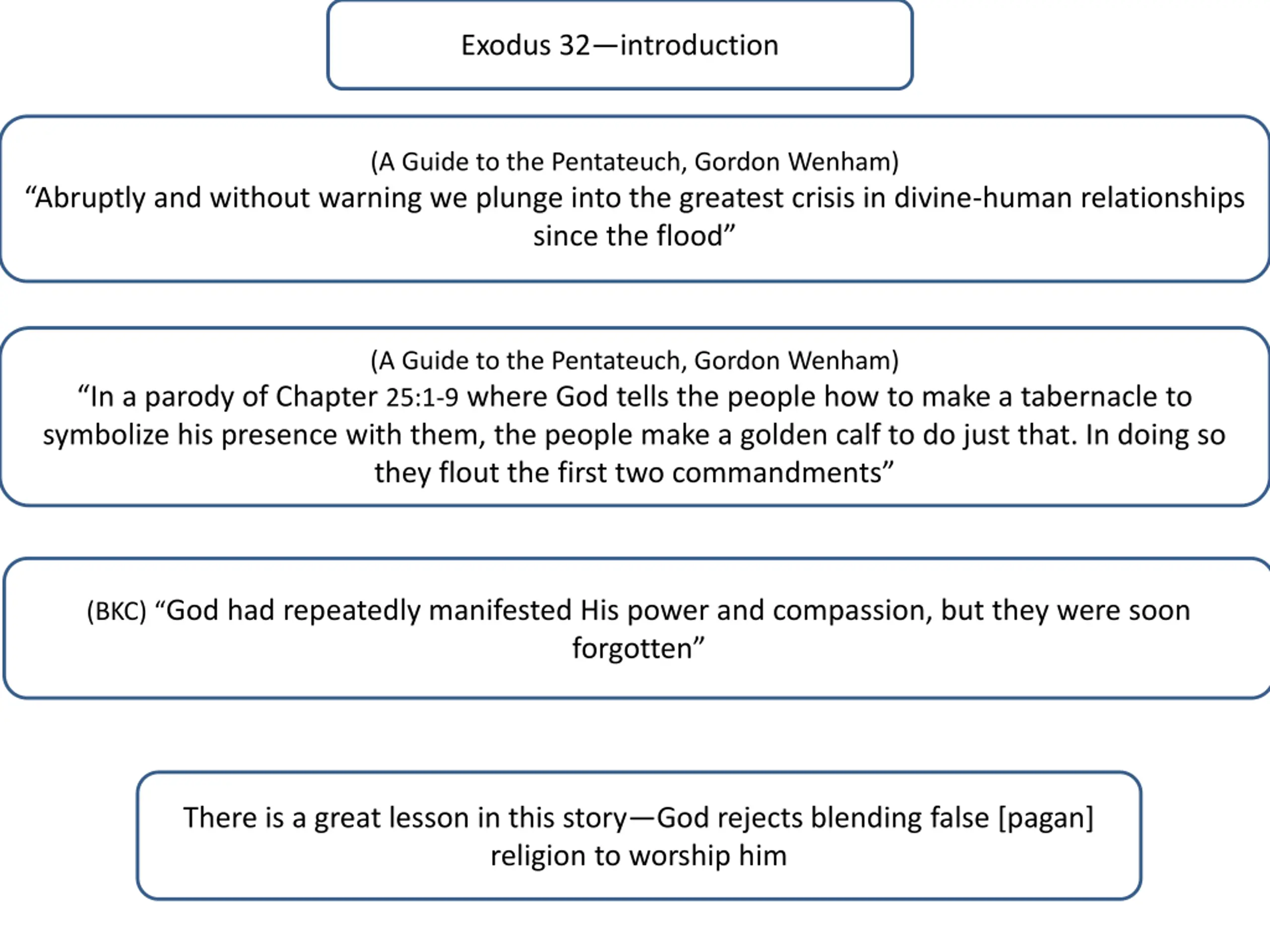 Exodus 32introduction (A Guide to the Pentateuch, Gordon Wenham) Abruptly and without warning we plunge into the greatest crisis in divine-human relationships since the flood (A Guide to the Pentateuch, Gordon Wenham) In a parody of Chapter 25:1-9 where God tells the people how to make a tabernacle to symbolize his presence with them, the people make a golden calf to do just that. In doing so they flout the first two commandments (BKC) God had repeatedly manifested His power and compassion, but they were soon forgotten There is a great lesson in this story God rejects blending false [pagan] religion to worship him