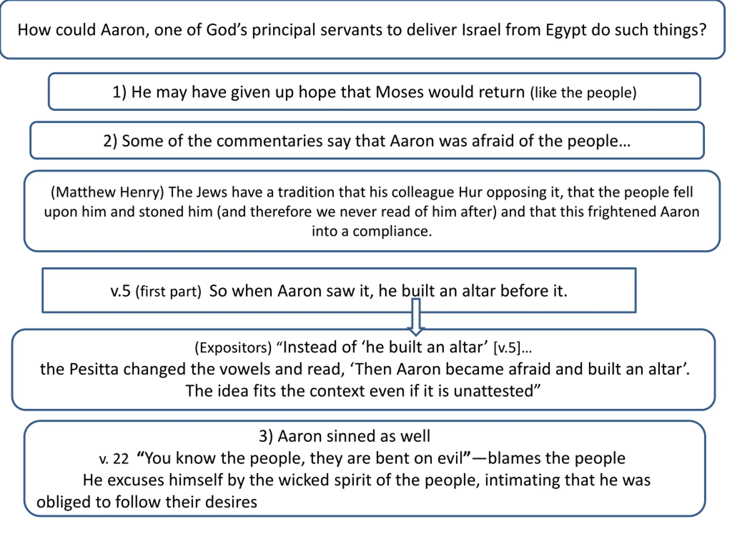 How could Aaron, one of Gods principal servants to deliver Israel from Egypt do such things? 1) He may have given up hope that Moses would return (like the people) 2) Some of the commentaries say that Aaron was afraid of the people (Matthew Henry) The Jews have a tradition that his colleague Hur opposing it, that the people fell upon him and stoned him (and therefore we never read of him after) and that this frightened Aaron into a compliance. v.5 (first part) So when Aaron saw it, he built an altar before it. (Expositors) Instead of he built an altar [v.5] the Pesitta changed the vowels and read, Then Aaron became afraid and built an altar . The idea fits the context even if it is unattested 3) Aaron sinned as well v. 22 You know the people, they are bent on evil blames the people He excuses himself by the wicked spirit of the people, intimating that he was obliged to follow their desires