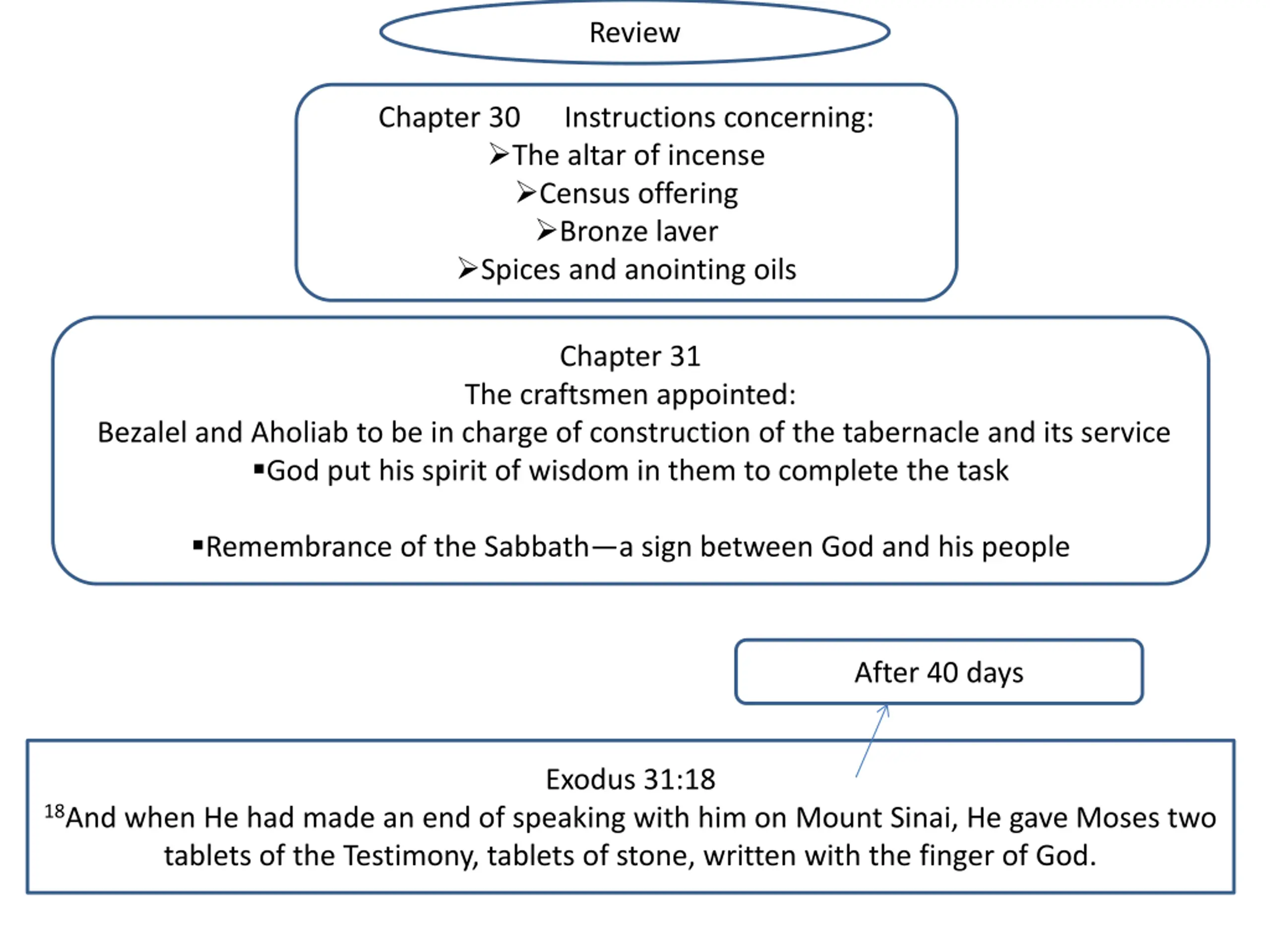 Review Chapter 30 Instructions concerning: The altar of incense Census offering Bronze laver Spices and anointing oils Chapter 31 The craftsmen appointed: Bezalel and Aholiab to be in charge of construction of the tabernacle and its service God put his spirit of wisdom in them to complete the task Remembrance of the Sabbath a sign between God and his people After 40 days Exodus 31:18 18And when He had made an end of speaking with him on Mount Sinai, He gave Moses two tablets of the Testimony, tablets of stone, written with the finger of God.
