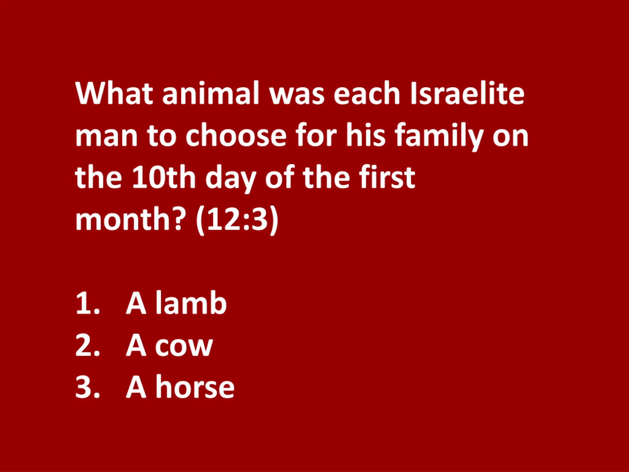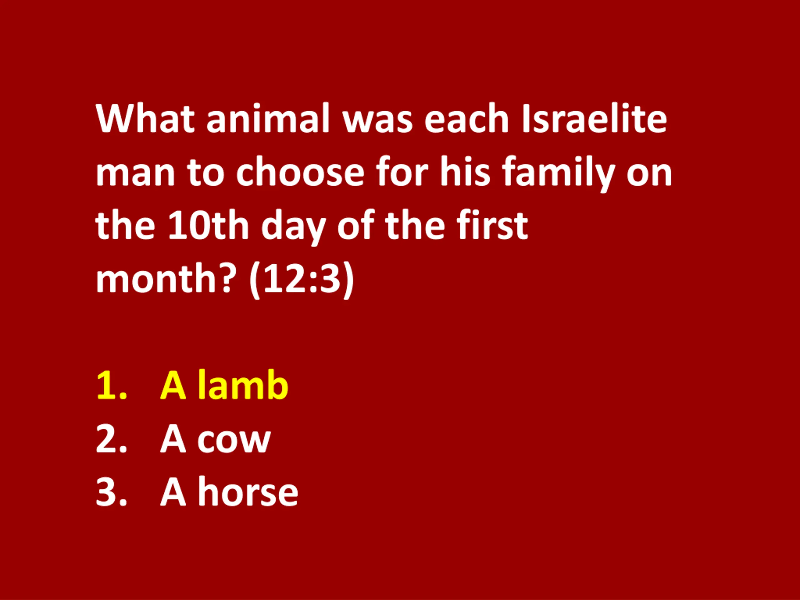 What animal was each Israelite man to choose for his family on the 10th day of the first month? (12:3) 1. A lamb 2. A cow 3. A horse