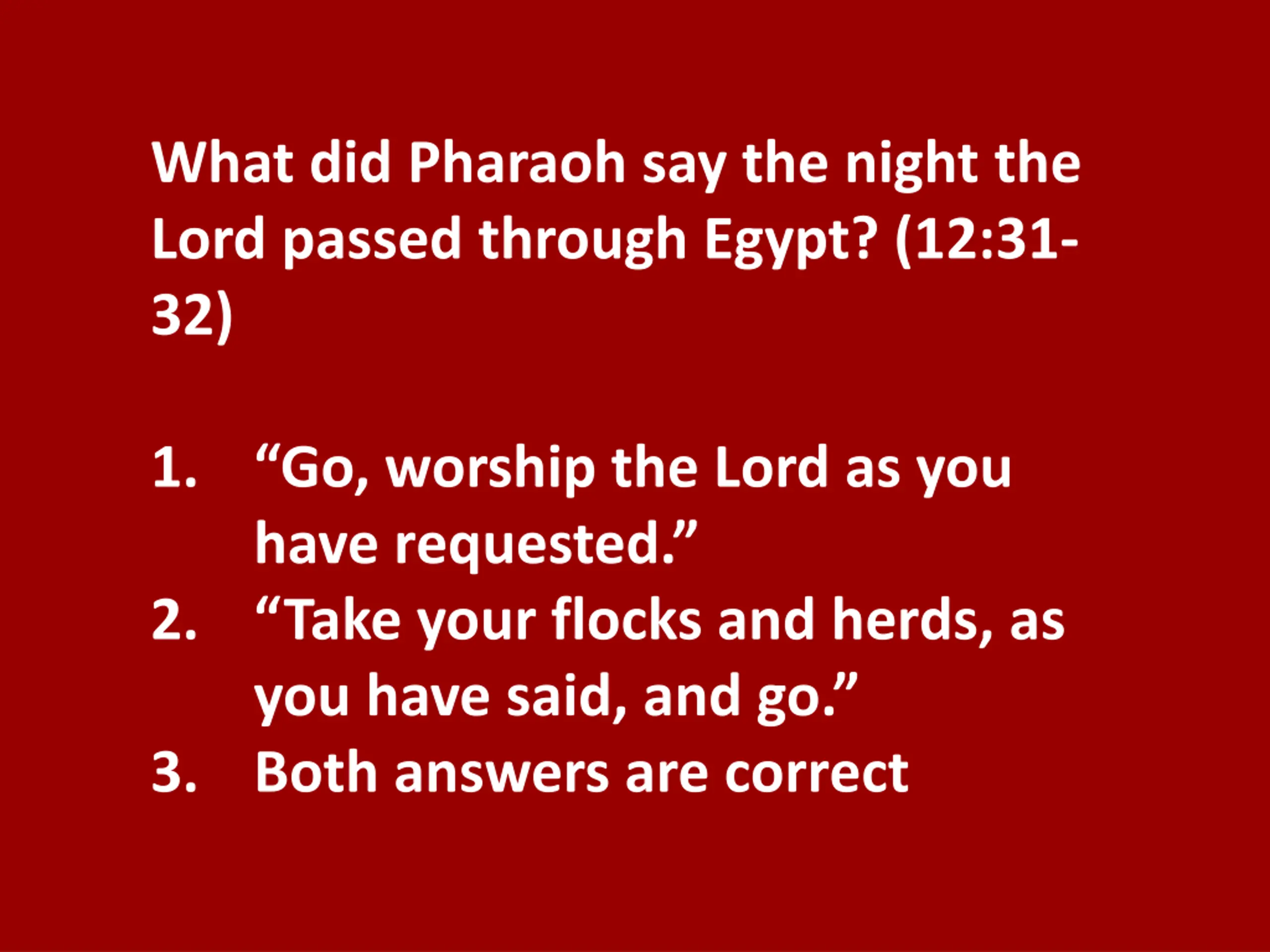 What did Pharaoh say the night the Lord passed through Egypt? (12:31- 32) 1. Go, worship the Lord as you have requested. 2. Take your flocks and herds, as you have said, and go. 3. Both answers are correct