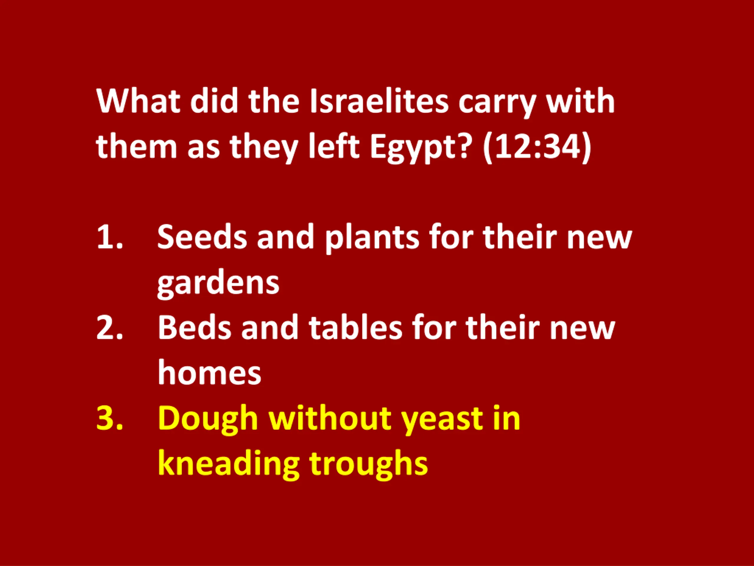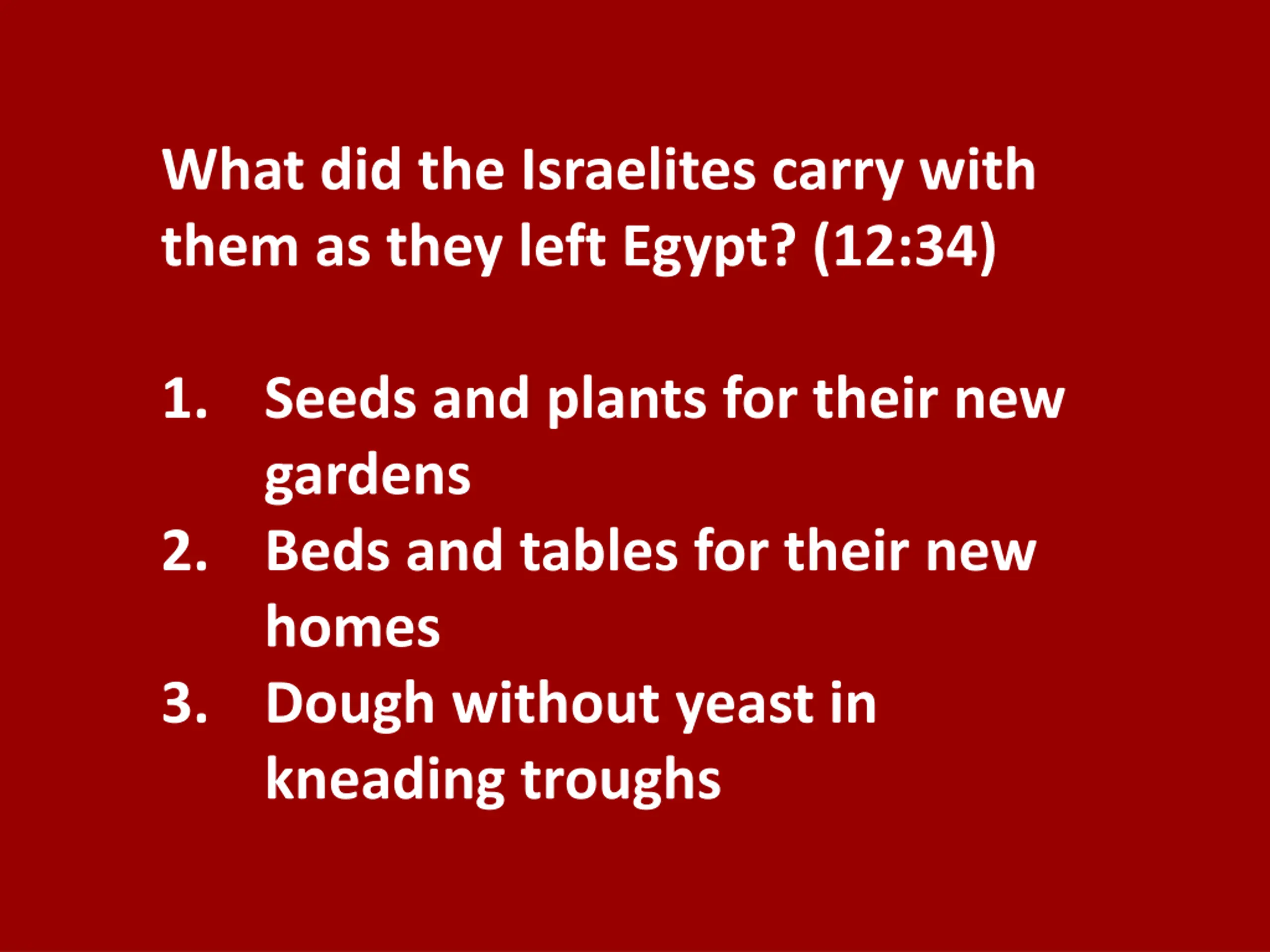 What did the Israelites carry with them as they left Egypt? (12:34) 1. Seeds and plants for their new gardens 2. Beds and tables for their new homes 3. Dough without yeast in kneading troughs