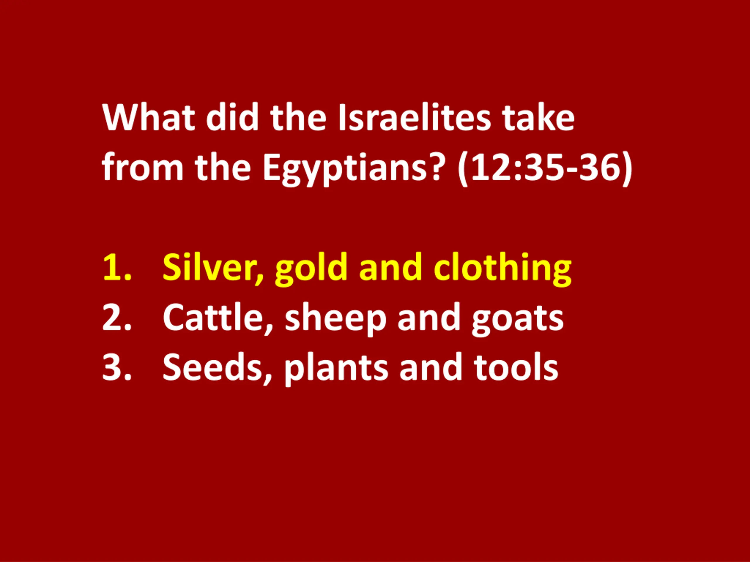 What did the Israelites take from the Egyptians? (12:35-36) 1. Silver, gold and clothing 2. Cattle, sheep and goats 3. Seeds, plants and tools