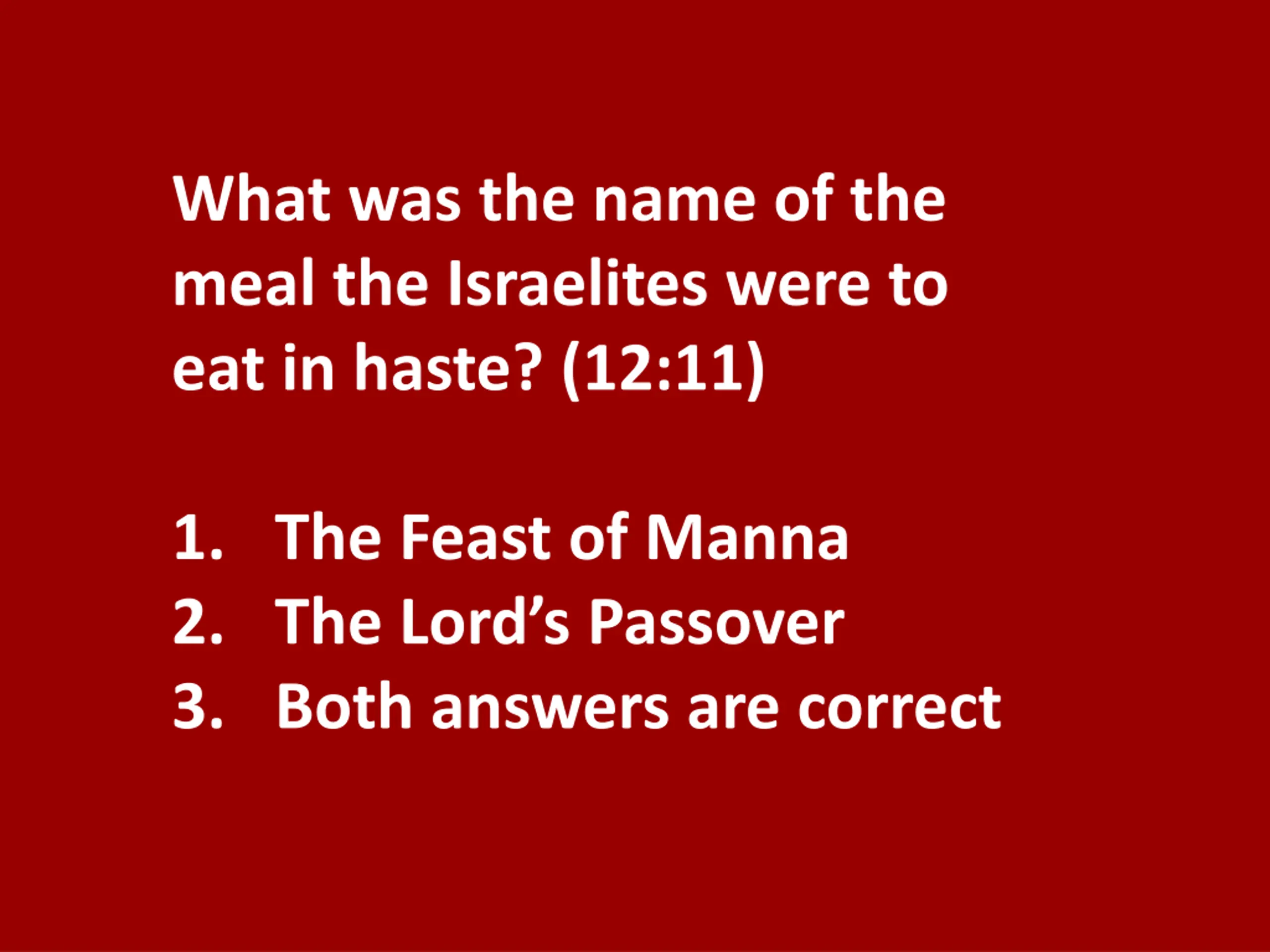 What was the name of the meal the Israelites were to eat in haste? (12:11) 1. The Feast of Manna 2. The Lord s Passover 3. Both answers are correct