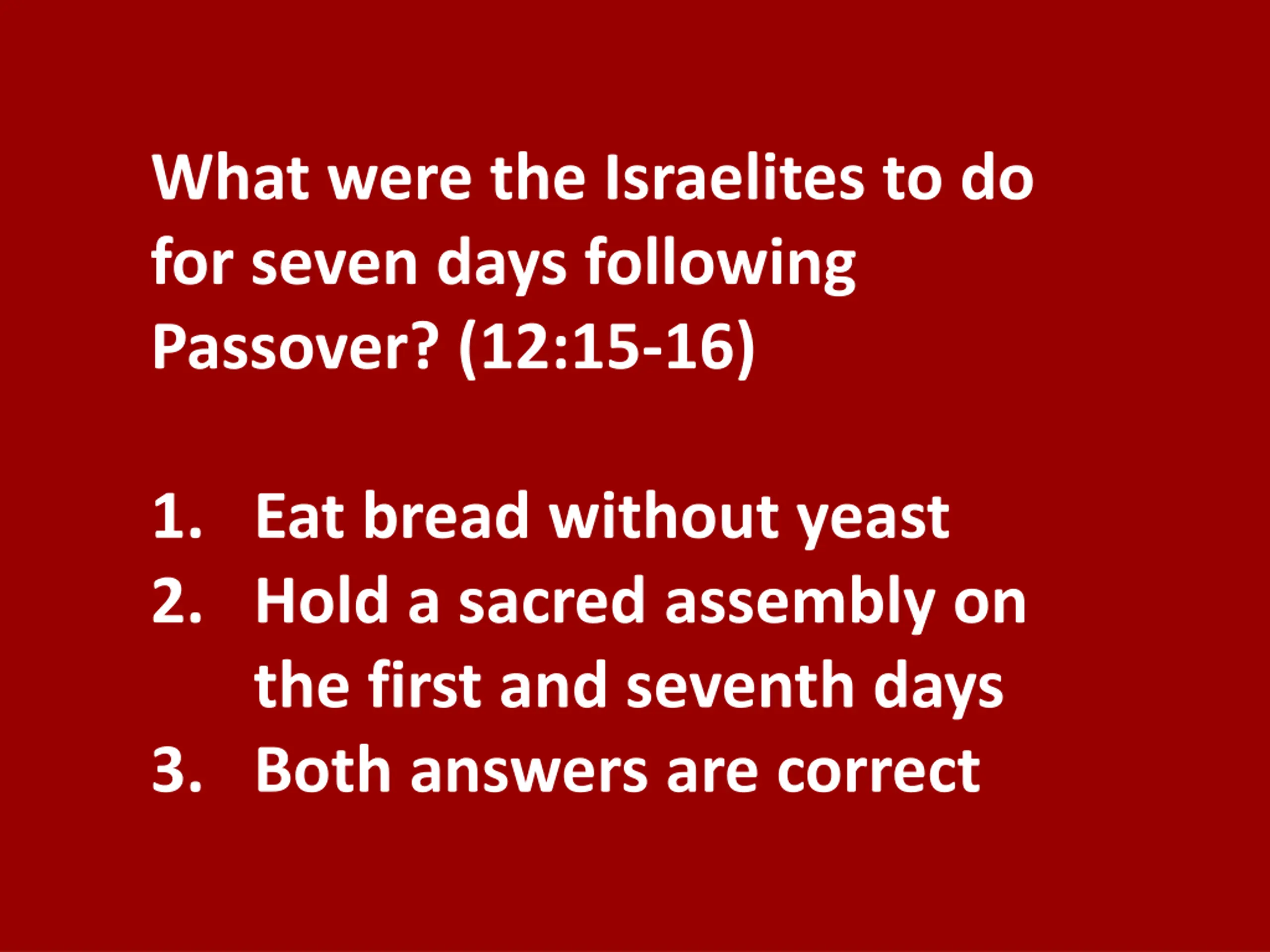 What were the Israelites to do for seven days following Passover? (12:15-16) 1. Eat bread without yeast 2. Hold a sacred assembly on the first and seventh days 3. Both answers are correct