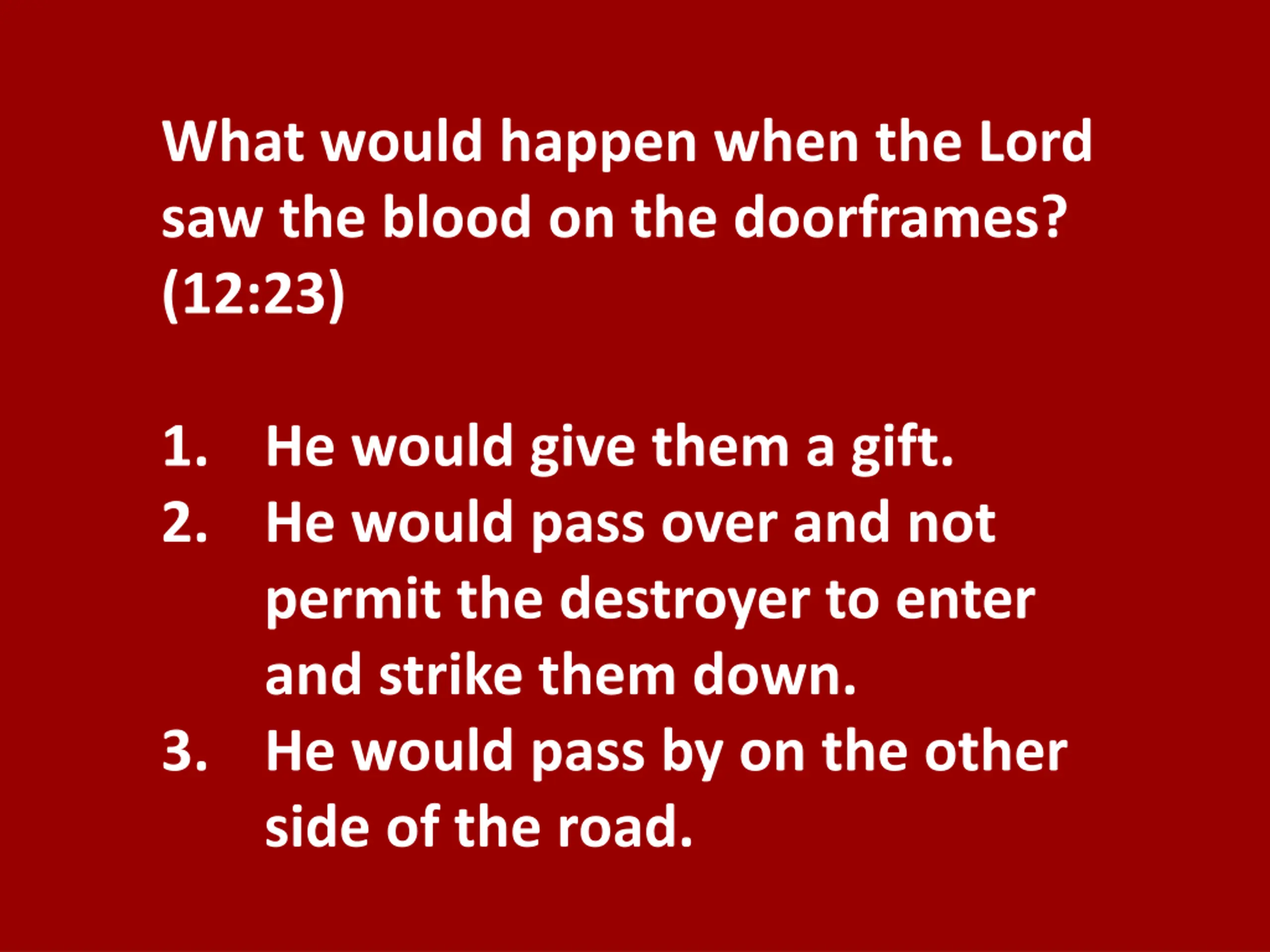 What would happen when the Lord saw the blood on the doorframes? (12:23) 1. He would give them a gift. 2. He would pass over and not permit the destroyer to enter and strike them down. 3. He would pass by on the other side of the road.