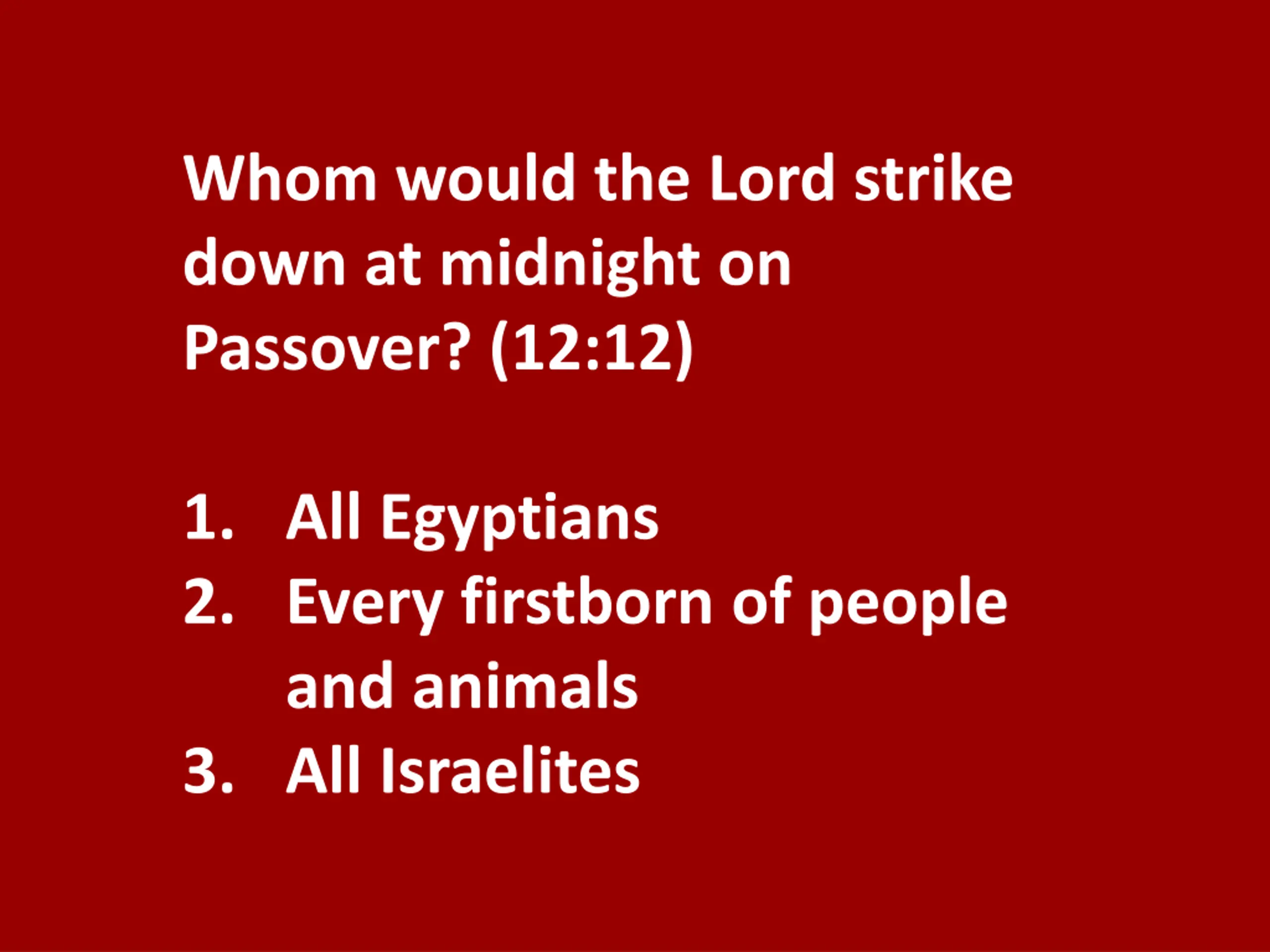 Whom would the Lord strike down at midnight on Passover? (12:12) 1. All Egyptians 2. Every firstborn of people and animals 3. All Israelites