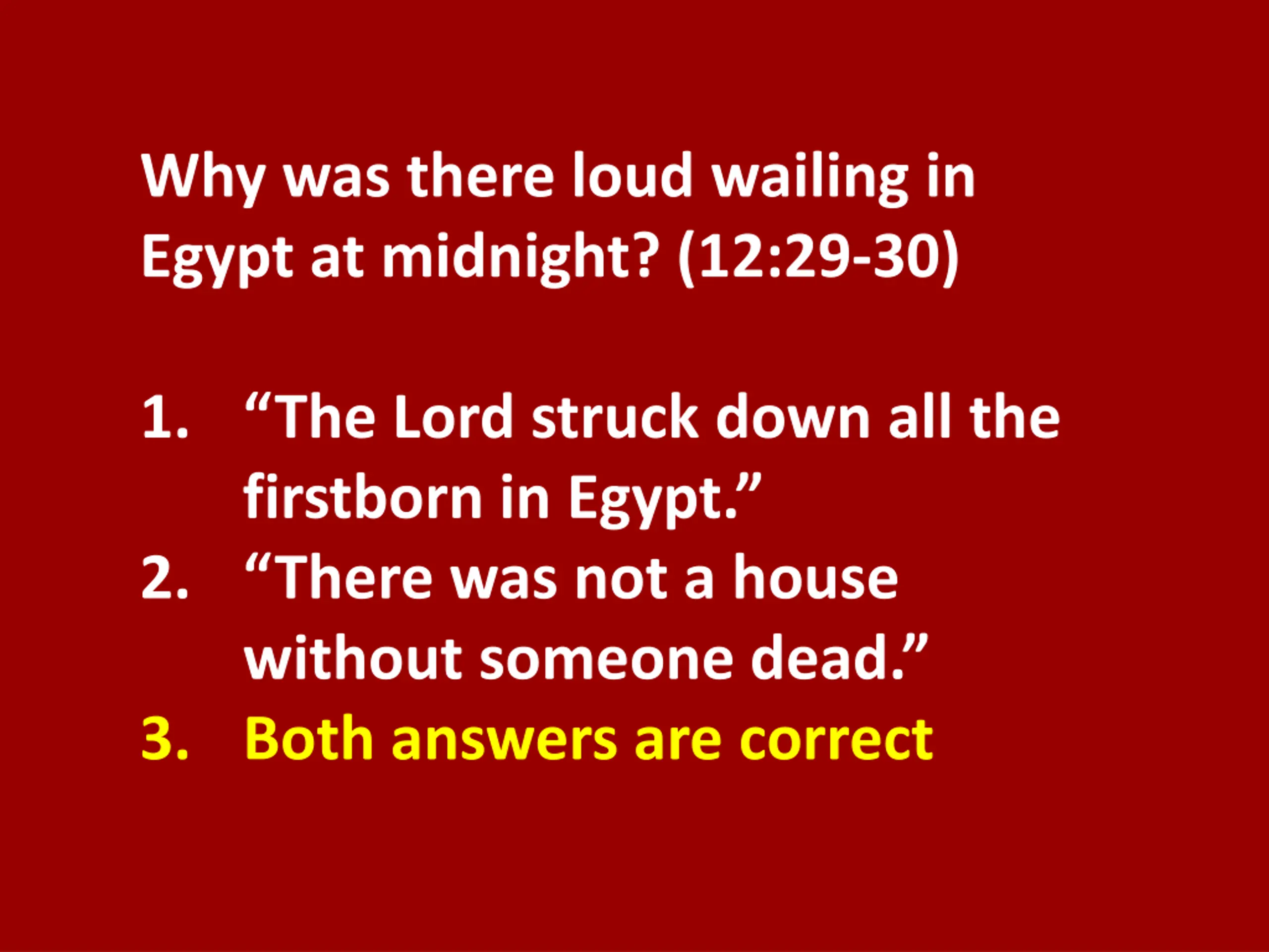 Why was there loud wailing in Egypt at midnight? (12:29-30) 1. The Lord struck down all the firstborn in Egypt. 2. There was not a house without someone dead. 3. Both answers are correct