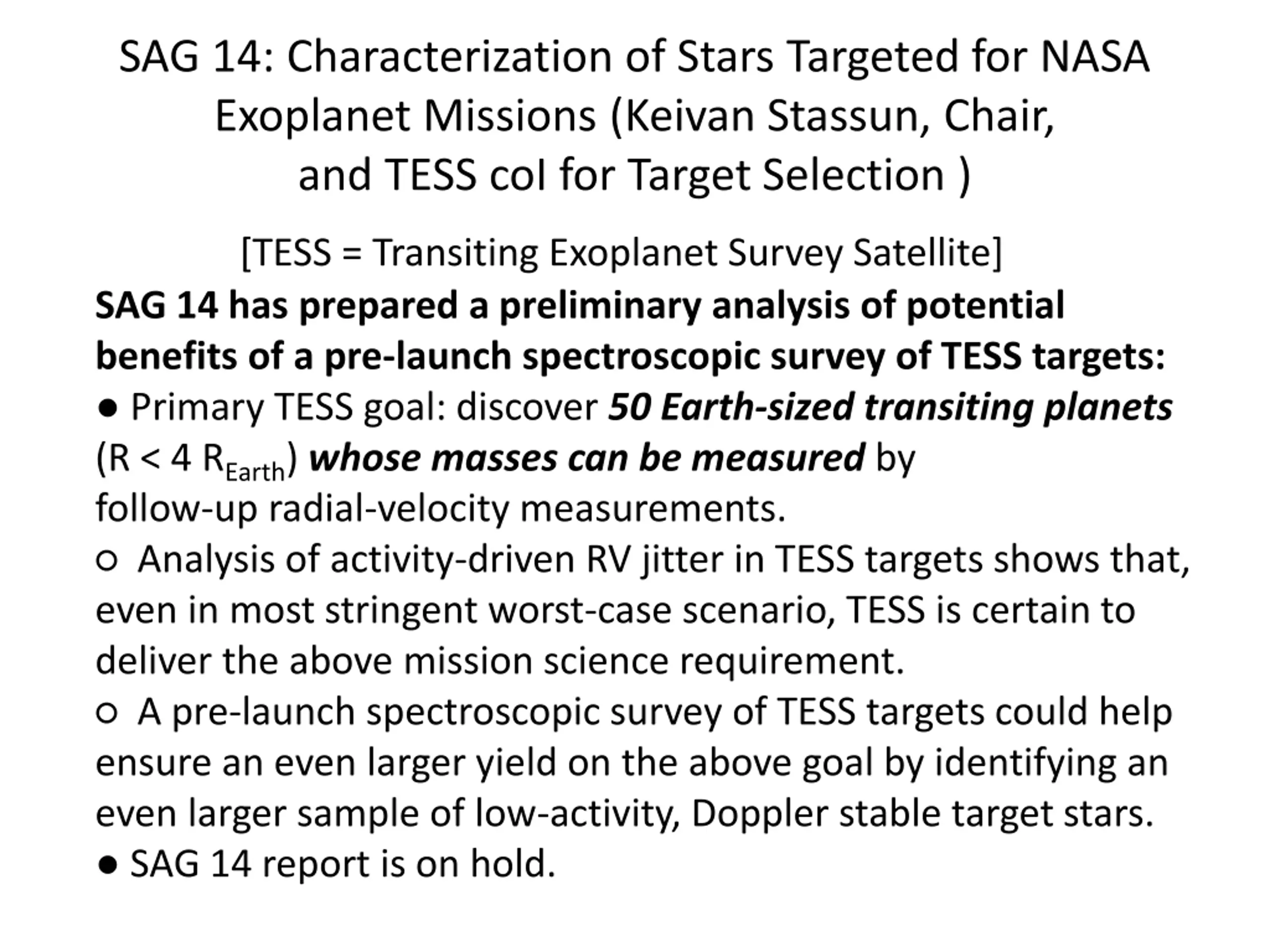 SAG 14: Characterization of Stars Targeted for NASA Exoplanet Missions (Keivan Stassun, Chair, and TESS coI for Target Selection ) [TESS = Transiting Exoplanet Survey Satellite] SAG 14 has prepared a preliminary analysis of potential benefits of a pre-launch spectroscopic survey of TESS targets: Primary TESS goal: discover 50 Earth-sized transiting planets (R < 4 REarth) whose masses can be measured by follow-up radial-velocity measurements. Analysis of activity-driven RV jitter in TESS targets shows that, even in most stringent worst-case scenario, TESS is certain to deliver the above mission science requirement. A pre-launch spectroscopic survey of TESS targets could help ensure an even larger yield on the above goal by identifying an even larger sample of low-activity, Doppler stable target stars. SAG 14 report is on hold.