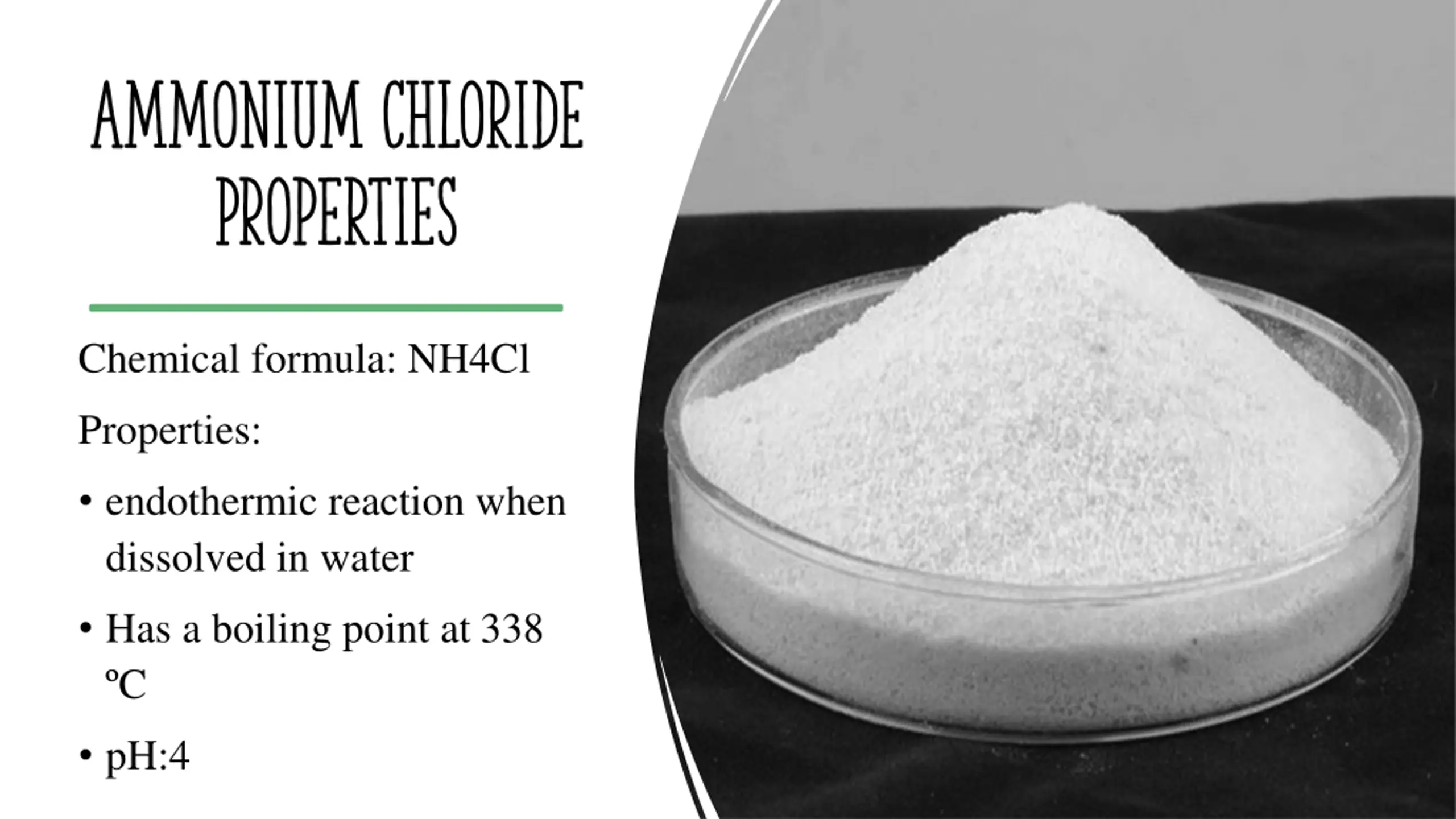 Ammonium chloride properties Chemical formula: NH4Cl Properties: endothermic reaction when dissolved in water Has a boiling point at 338 C pH:4