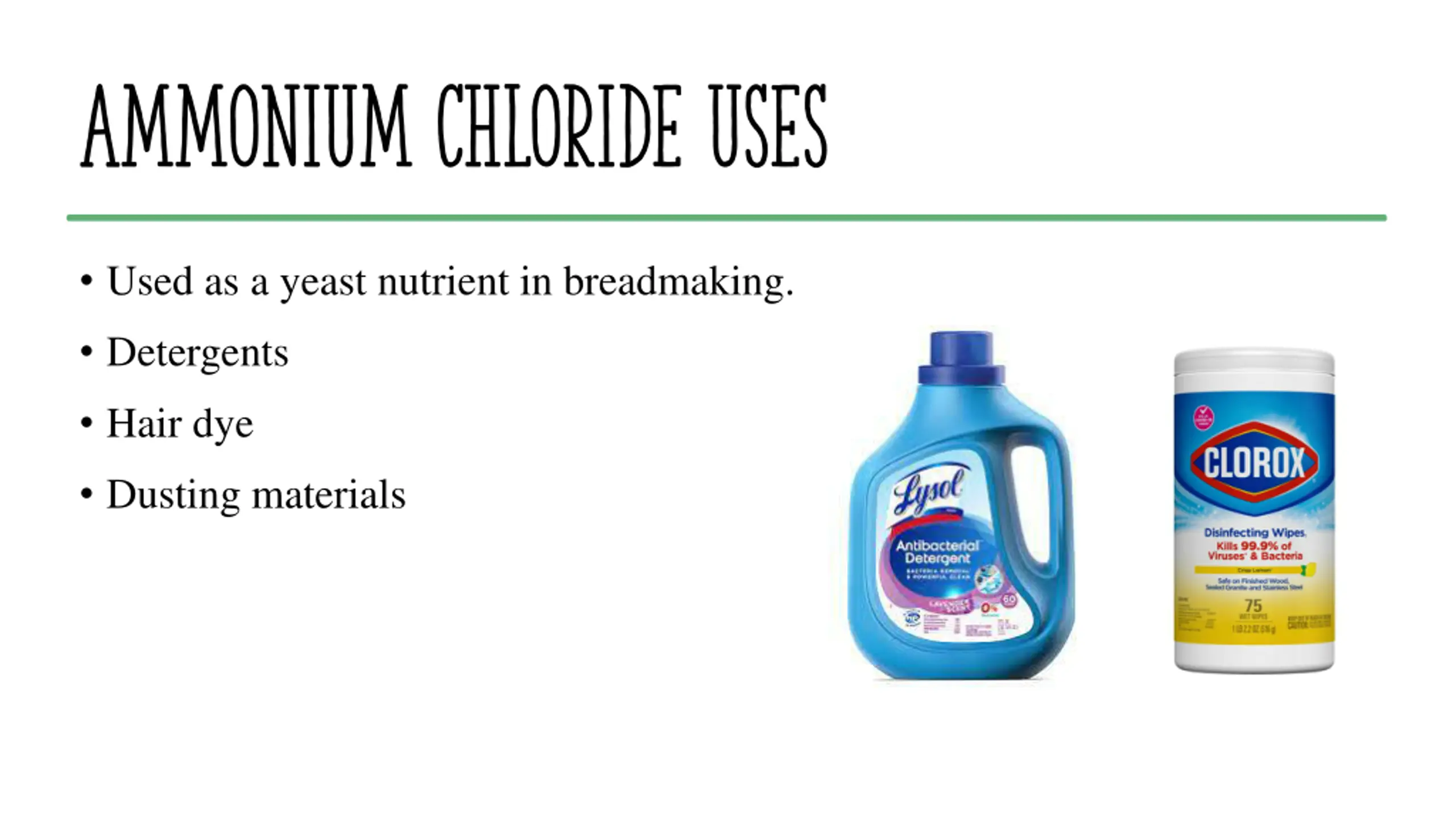 Ammonium chloride uses Used as a yeast nutrient in breadmaking. Detergents Hair dye Dusting materials