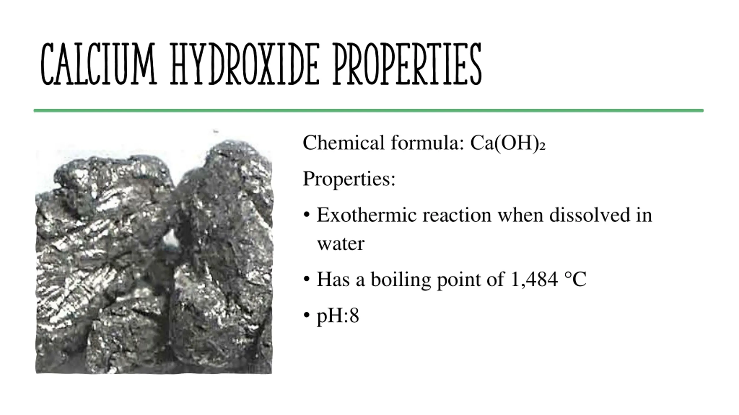 Calcium hydroxide properties Chemical formula: Ca(OH) Properties: Exothermic reaction when dissolved in water Has a boiling point of 1,484 C pH:8