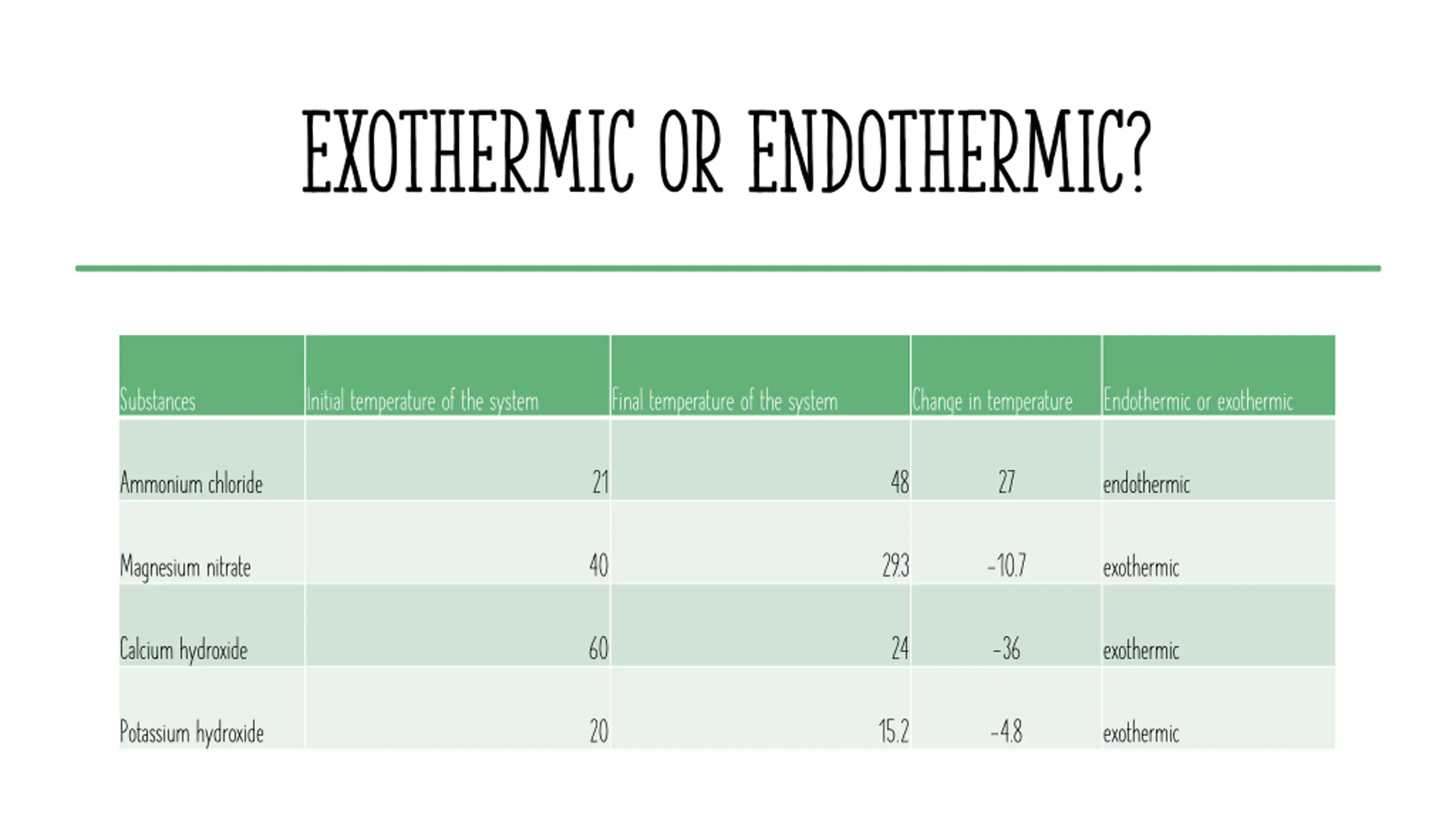 Exothermic or Endothermic? Substances Initial temperature of the system Final temperature of the system Change in temperature Endothermic or exothermic Ammonium chloride 21 48 27 endothermic Magnesium nitrate 40 29.3 -10.7 exothermic Calcium hydroxide 60 24 -36 exothermic Potassium hydroxide 20 15.2 -4.8 exothermic