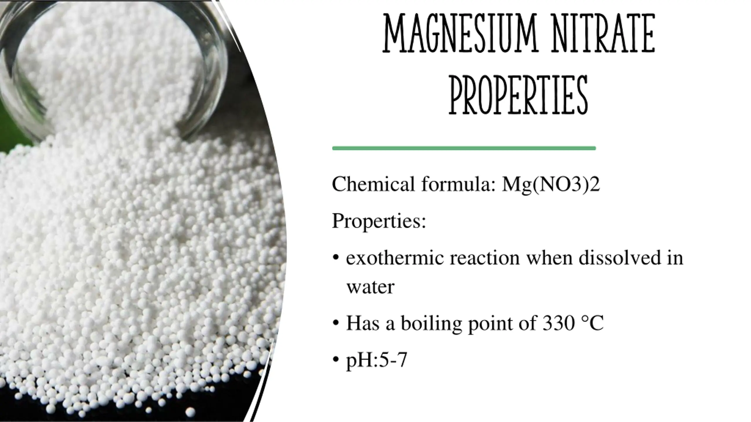 Magnesium nitrate properties Chemical formula: Mg(NO3)2 Properties: exothermic reaction when dissolved in water Has a boiling point of 330 C pH:5-7