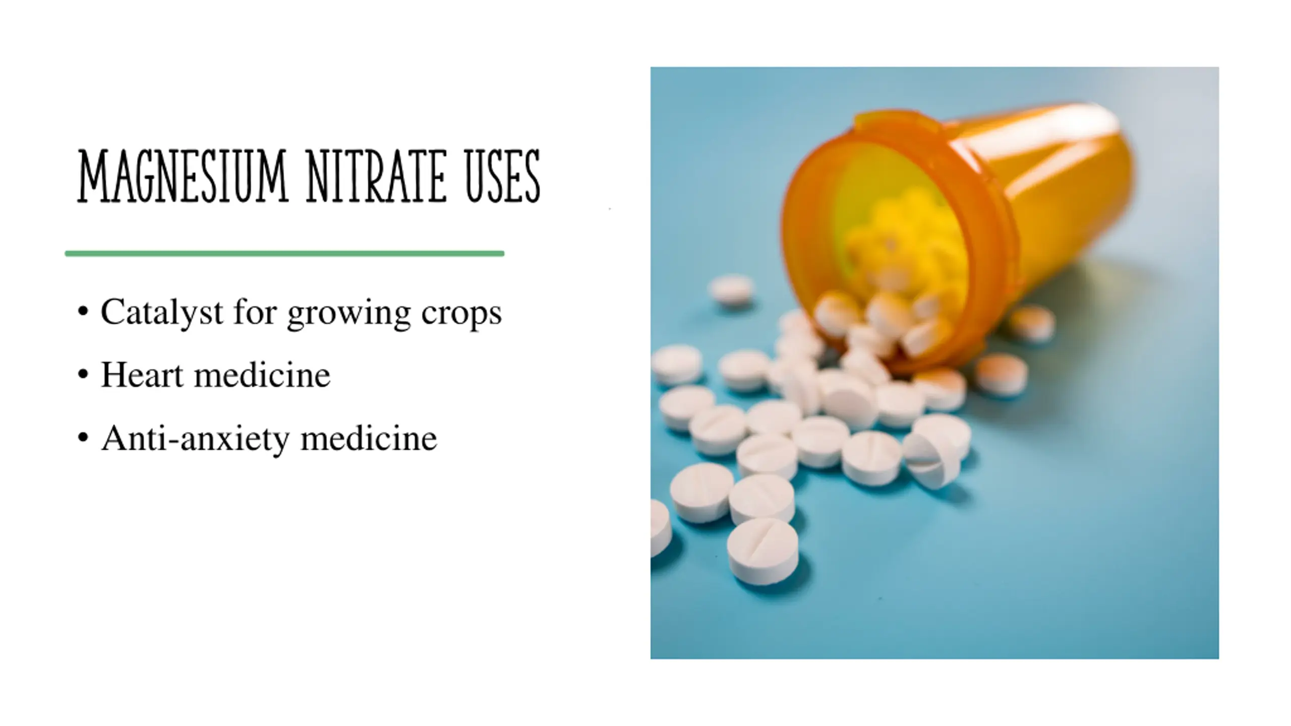 Magnesium nitrate uses Catalyst for growing crops Heart medicine Anti-anxiety medicine