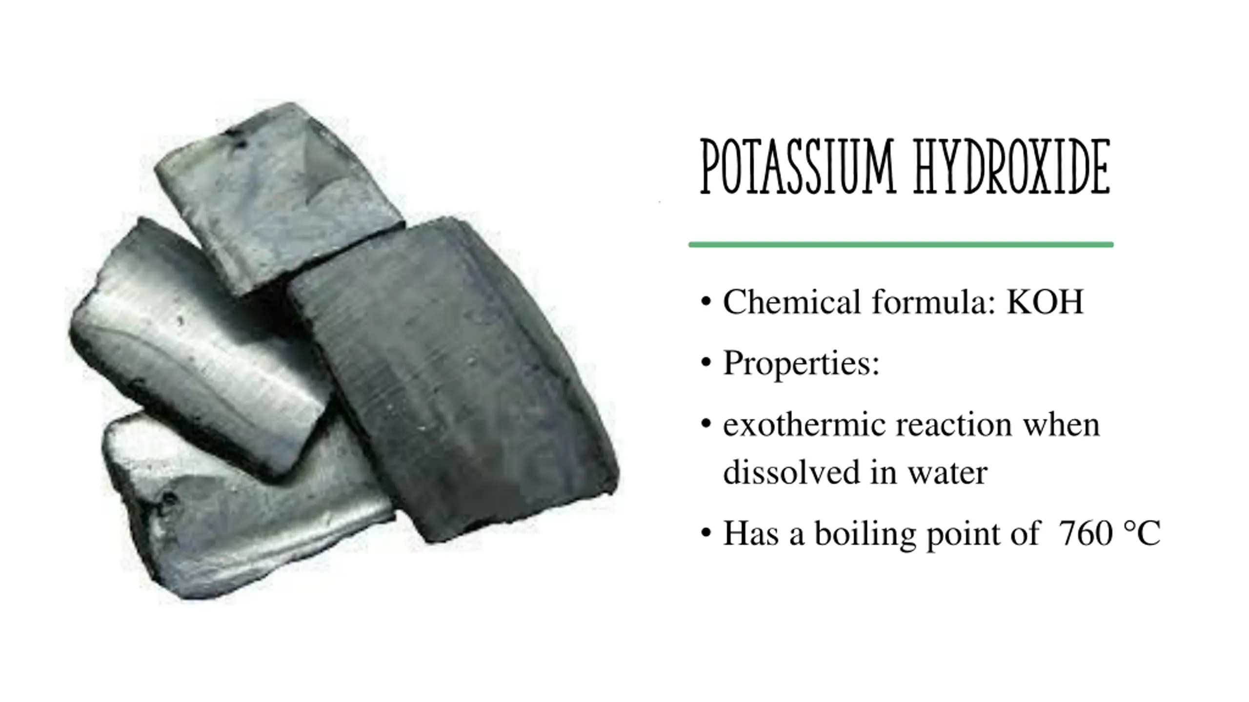 Potassium hydroxide Chemical formula: KOH Properties: exothermic reaction when dissolved in water Has a boiling point of 760 C