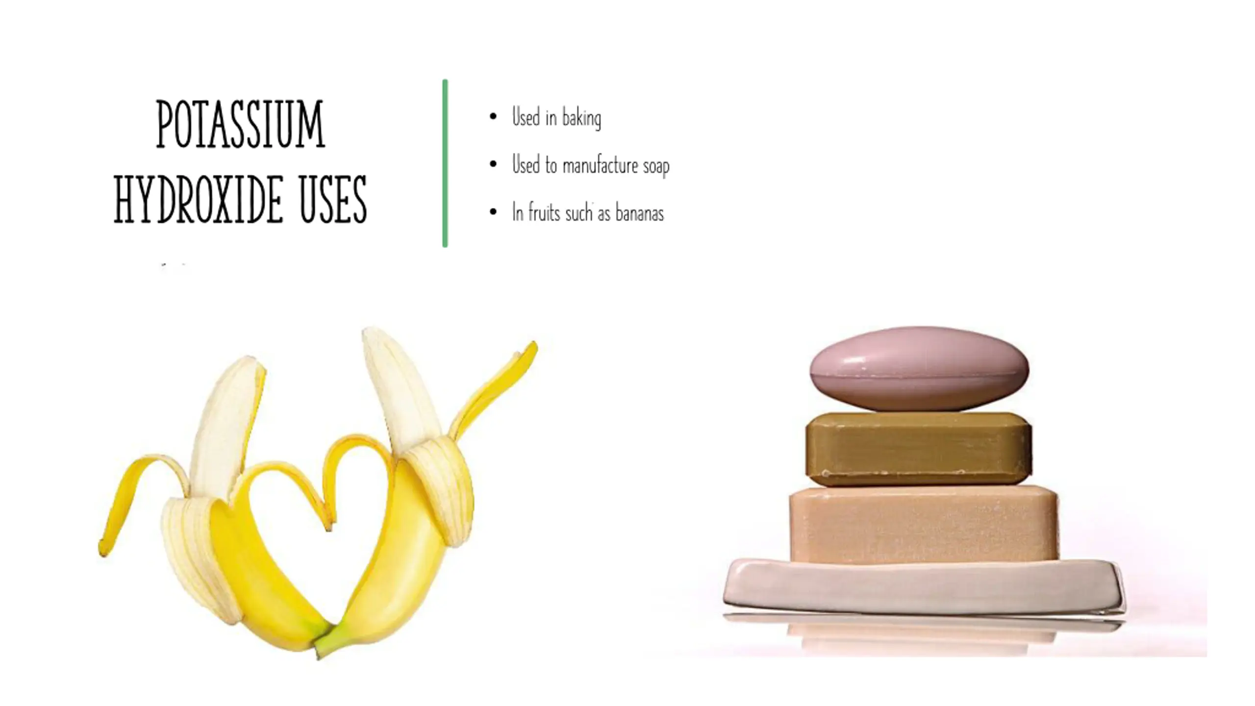 Potassium hydroxide uses Used in baking Used to manufacture soap In fruits such as bananas