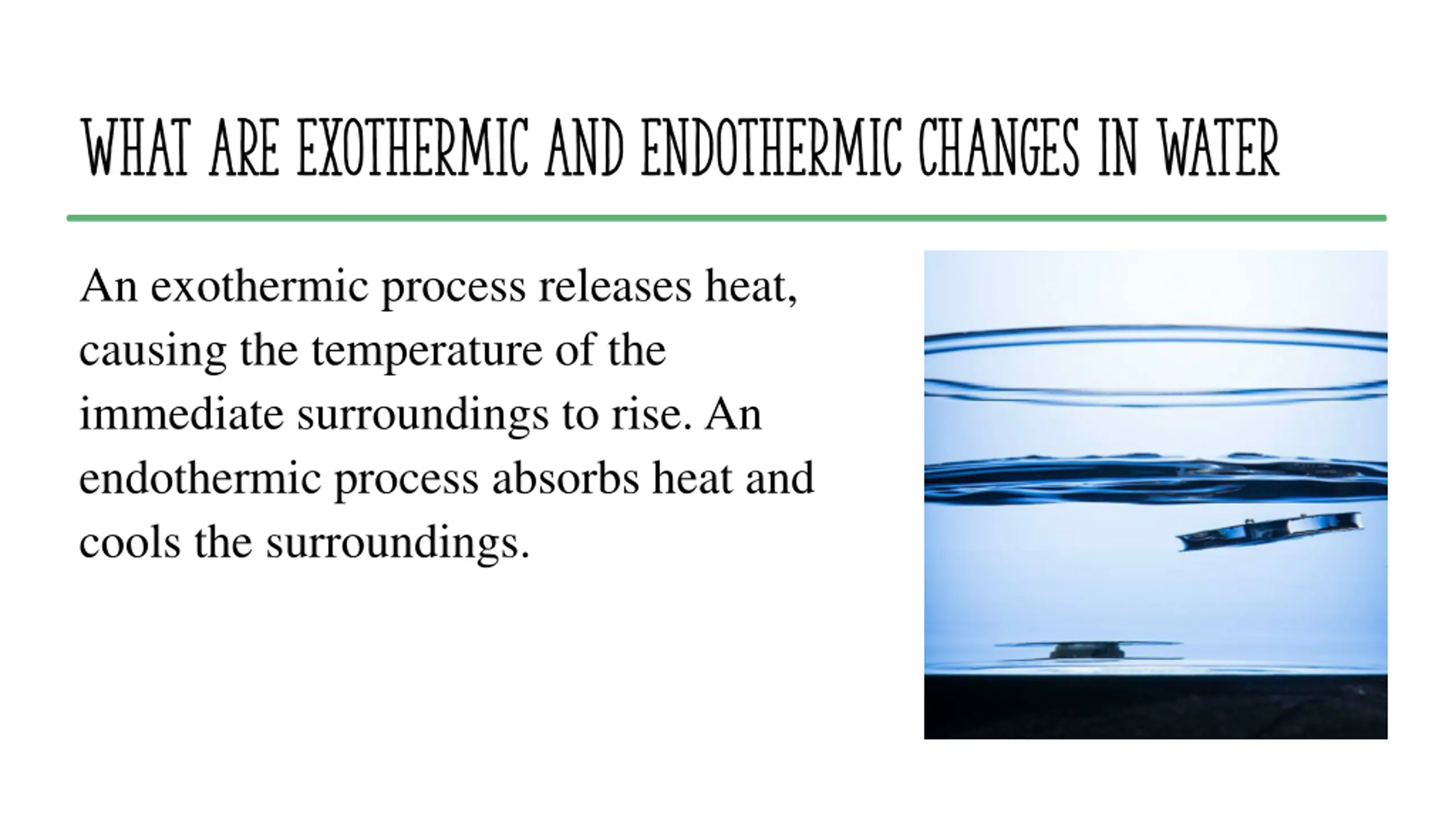 What are exothermic and endothermic changes in water An exothermic process releases heat, causing the temperature of the immediate surroundings to rise.An endothermic process absorbs heat and cools the surroundings.