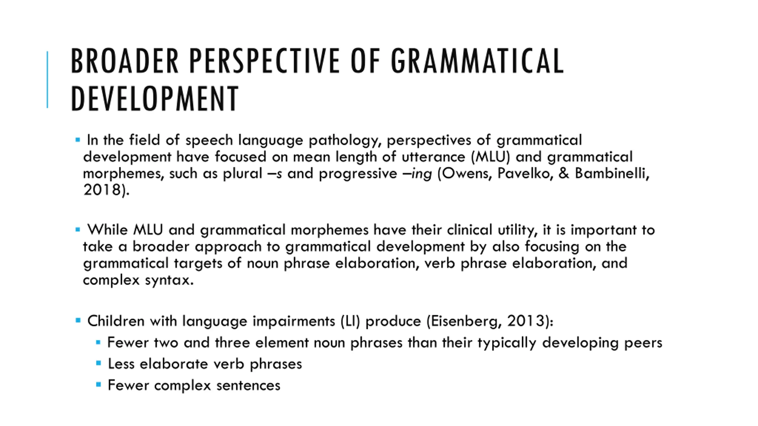 BROADER PERSPECTIVE OF GRAMMATICAL DEVELOPMENT In the field of speech language pathology, perspectives of grammatical development have focused on mean length of utterance (MLU) and grammatical morphemes, such as plural s and progressive ing (Owens, Pavelko, & Bambinelli, 2018). While MLU and grammatical morphemes have their clinical utility, it is important to take a broader approach to grammatical development by also focusing on the grammatical targets of noun phrase elaboration, verb phrase elaboration, and complex syntax. Children with language impairments (LI) produce (Eisenberg, 2013): Fewer two and three element noun phrases than their typically developing peers Less elaborate verb phrases Fewer complex sentences
