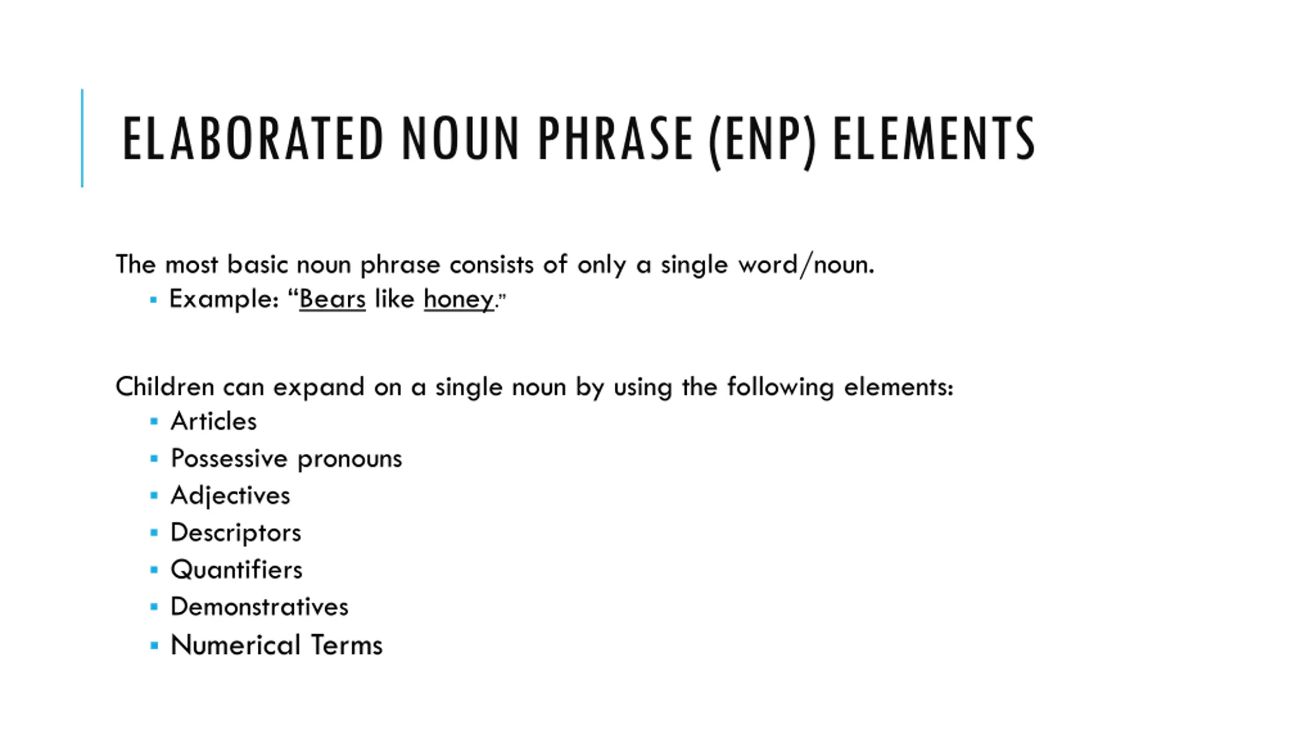 ELABORATED NOUN PHRASE (ENP) ELEMENTS The most basic noun phrase consists of only a single word/noun. Example: Bears like honey. Children can expand on a single noun by using the following elements: Articles Possessive pronouns Adjectives Descriptors Quantifiers Demonstratives Numerical Terms