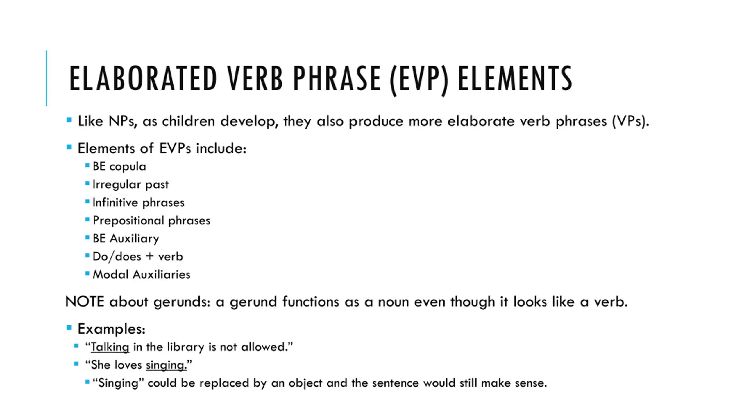ELABORATED VERB PHRASE (EVP) ELEMENTS Like NPs, as children develop, they also produce more elaborate verb phrases (VPs). Elements of EVPs include: BE copula Irregular past Infinitive phrases Prepositional phrases BE Auxiliary Do/does + verb Modal Auxiliaries NOTE about gerunds: a gerund functions as a noun even though it looks like a verb. Examples: Talking in the library is not allowed. She loves singing. Singing could be replaced by an object and the sentence would still make sense.