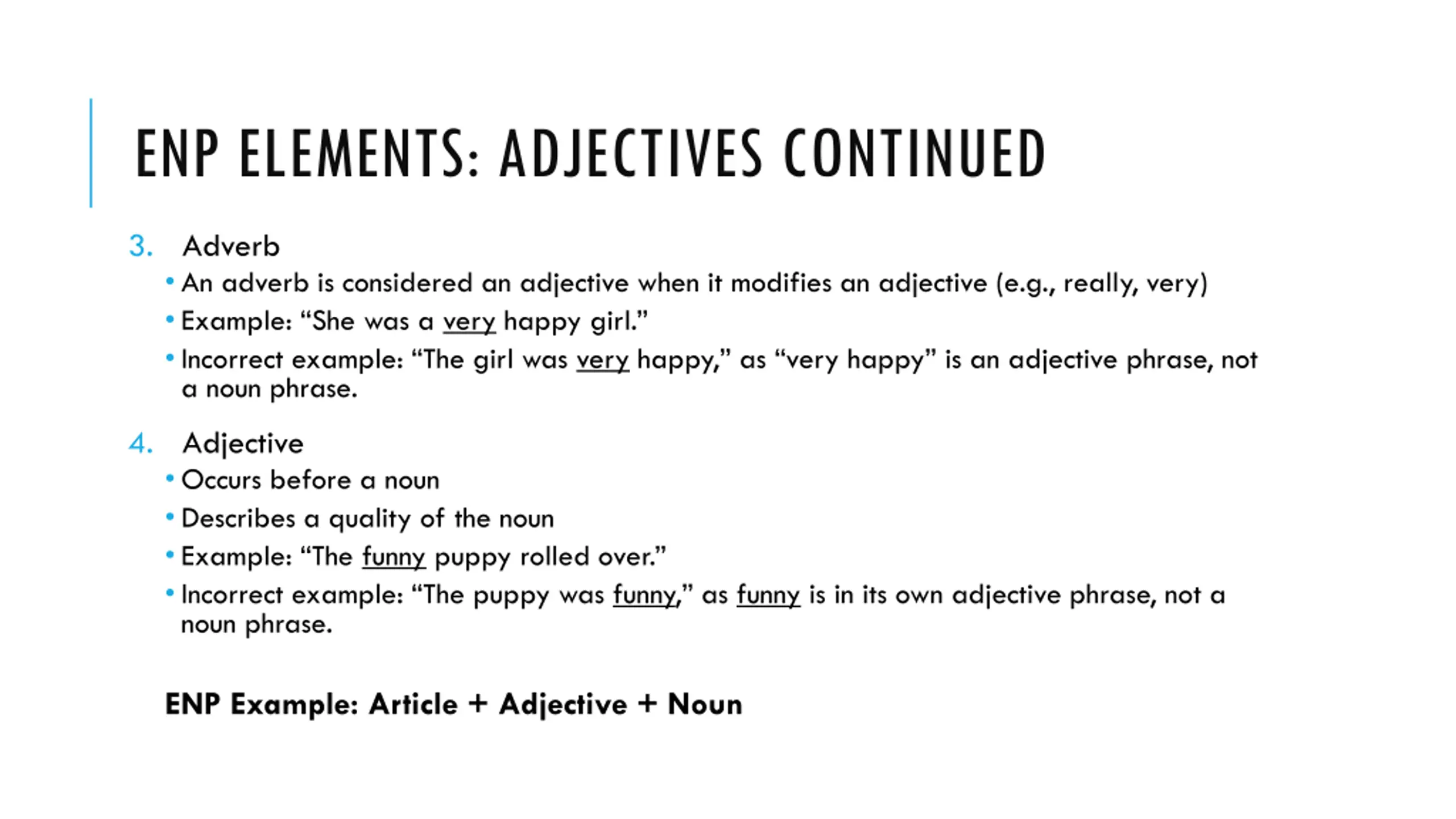ENP ELEMENTS: ADJECTIVES CONTINUED 3. Adverb An adverb is considered an adjective when it modifies an adjective (e.g., really, very) Example: She was a very happy girl. Incorrect example: The girl was very happy, as very happy is an adjective phrase, not a noun phrase. 4. Adjective Occurs before a noun Describes a quality of the noun Example: The funny puppy rolled over. Incorrect example: The puppy was funny, as funny is in its own adjective phrase, not a noun phrase. ENP Example: Article + Adjective + Noun
