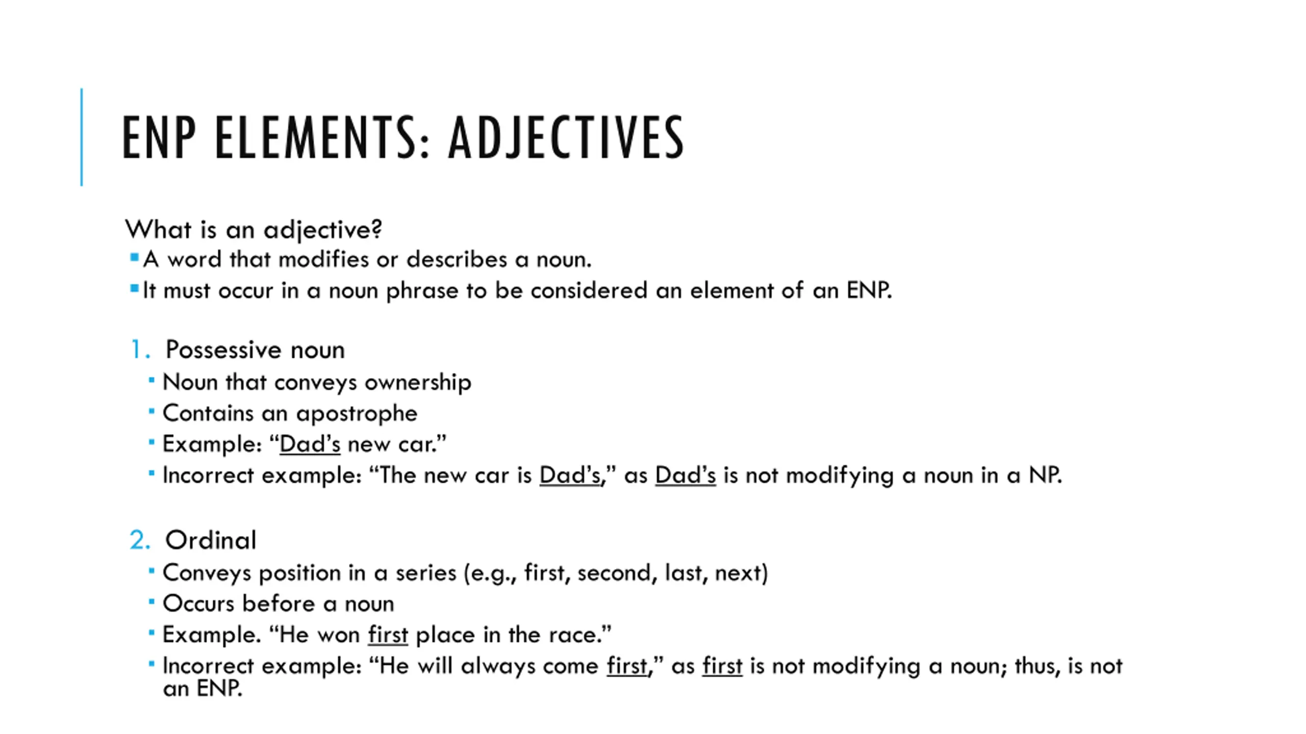 ENP ELEMENTS: ADJECTIVES What is an adjective? A word that modifies or describes a noun. It must occur in a noun phrase to be considered an element of an ENP. 1. Possessive noun Noun that conveys ownership Contains an apostrophe Example: Dad snew car. Incorrect example: The new car is Dad s, as Dad sis not modifying a noun in a NP. 2. Ordinal Conveys position in a series (e.g., first, second, last, next) Occurs before a noun Example. He won first place in the race. Incorrect example: He will always come first, as first is not modifying a noun; thus, is not an ENP.