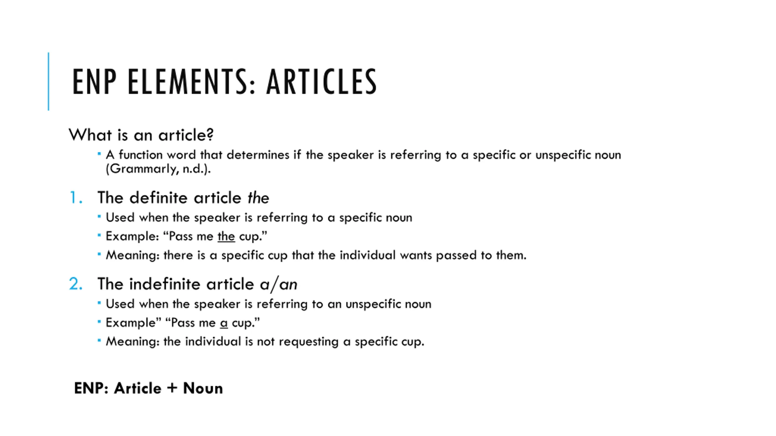 ENP ELEMENTS: ARTICLES What is an article? A function word that determines if the speaker is referring to a specific or unspecific noun (Grammarly, n.d.). 1. The definite article the Used when the speaker is referring to a specific noun Example: Pass me the cup. Meaning: there is a specific cup that the individual wants passed to them. 2. The indefinite article a/an Used when the speaker is referring to an unspecific noun Example Pass me a cup. Meaning: the individual is not requesting a specific cup. ENP: Article + Noun
