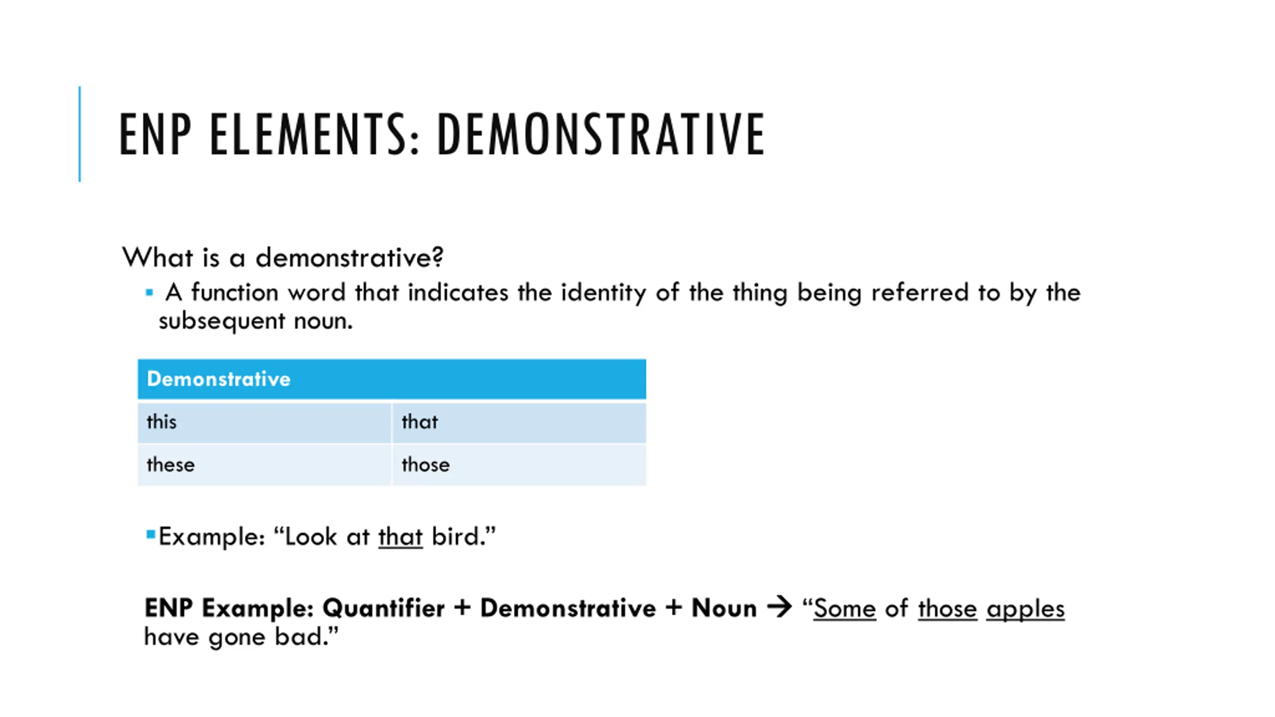 ENP ELEMENTS: DEMONSTRATIVE What is a demonstrative? A function word that indicates the identity of the thing being referred to by the subsequent noun. Demonstrative this that these those Example: Look at that bird. ENP Example: Quantifier + Demonstrative + Noun have gone bad. Some of those apples