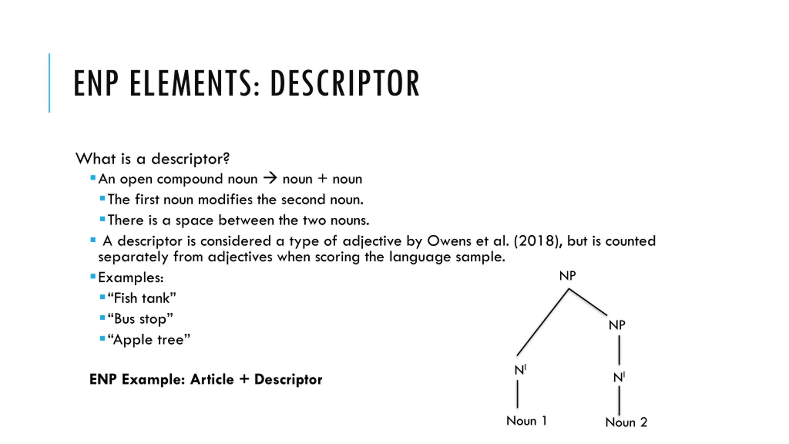 ENP ELEMENTS: DESCRIPTOR What is a descriptor? An open compound noun noun + noun The first noun modifies the second noun. There is a space between the two nouns. A descriptor is considered a type of adjective by Owens et al. (2018), but is counted separately from adjectives when scoring the language sample. Examples: Fish tank Bus stop Apple tree NP NP NI NI ENP Example: Article + Descriptor Noun 1 Noun 2