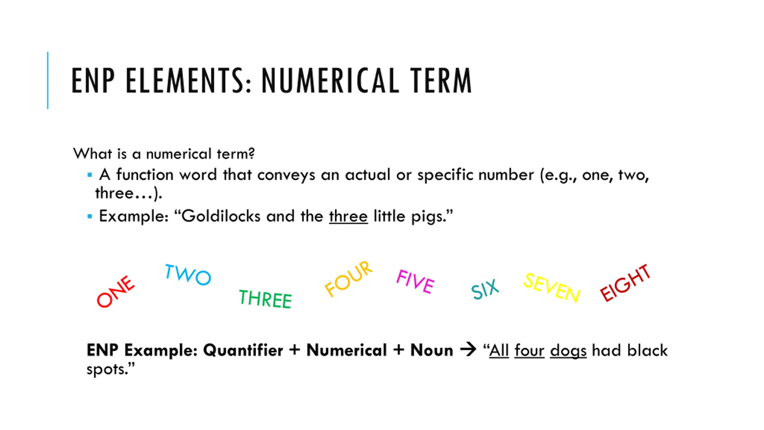 ENP ELEMENTS: NUMERICAL TERM What is a numerical term? A function word that conveys an actual or specific number (e.g., one, two, three ). Example: Goldilocks and the three little pigs. ENP Example: Quantifier + Numerical + Noun spots. All four dogs had black