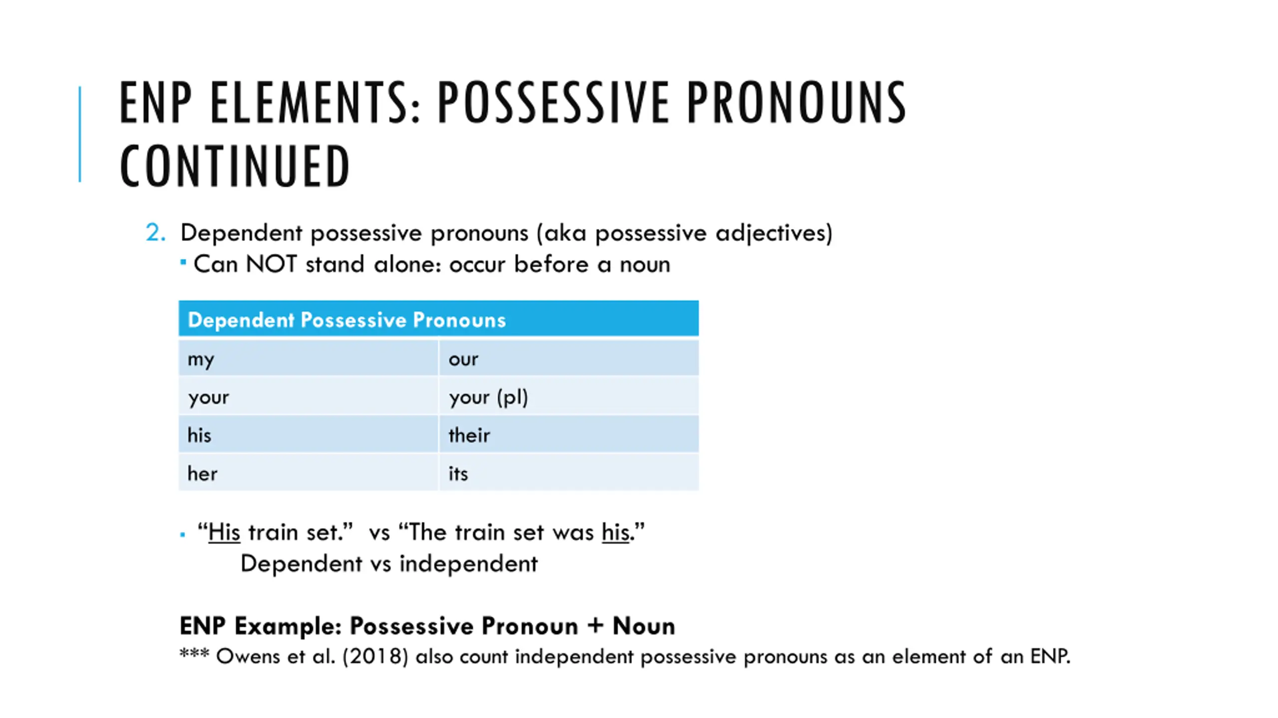 ENP ELEMENTS: POSSESSIVE PRONOUNS CONTINUED 2. Dependent possessive pronouns (aka possessive adjectives) Can NOT stand alone: occur before a noun Dependent Possessive Pronouns my our your your (pl) his their her its His train set. vs The train set was his. Dependent vs independent ENP Example: Possessive Pronoun + Noun *** Owens et al. (2018) also count independent possessive pronouns as an element of an ENP.
