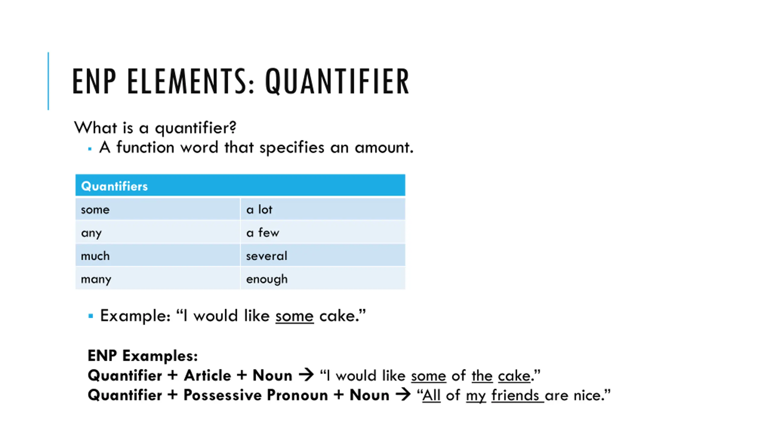 ENP ELEMENTS: QUANTIFIER What is a quantifier? A function word that specifies an amount. Quantifiers some a lot any a few much several many enough Example: I would like some cake. ENP Examples: Quantifier + Article + Noun Quantifier + Possessive Pronoun + Noun I would like some of the cake. All of my friends are nice.