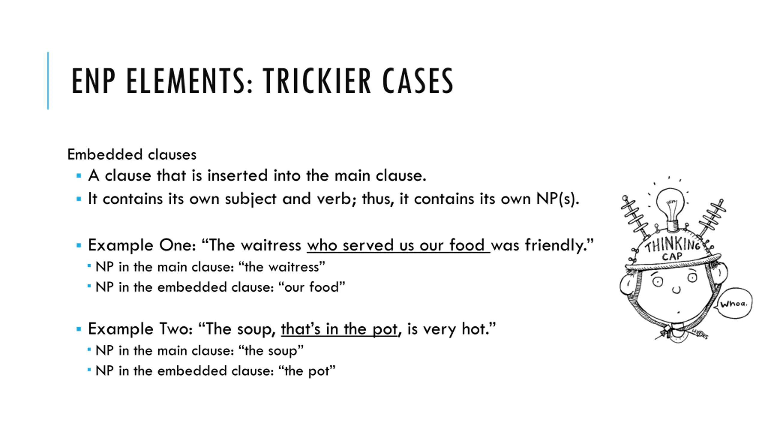 ENP ELEMENTS: TRICKIER CASES Embedded clauses A clause that is inserted into the main clause. It contains its own subject and verb; thus, it contains its own NP(s). Example One: The waitress who served us our food was friendly. NP in the main clause: the waitress NP in the embedded clause: our food Example Two: The soup, that s in the pot, is very hot. NP in the main clause: the soup NP in the embedded clause: the pot