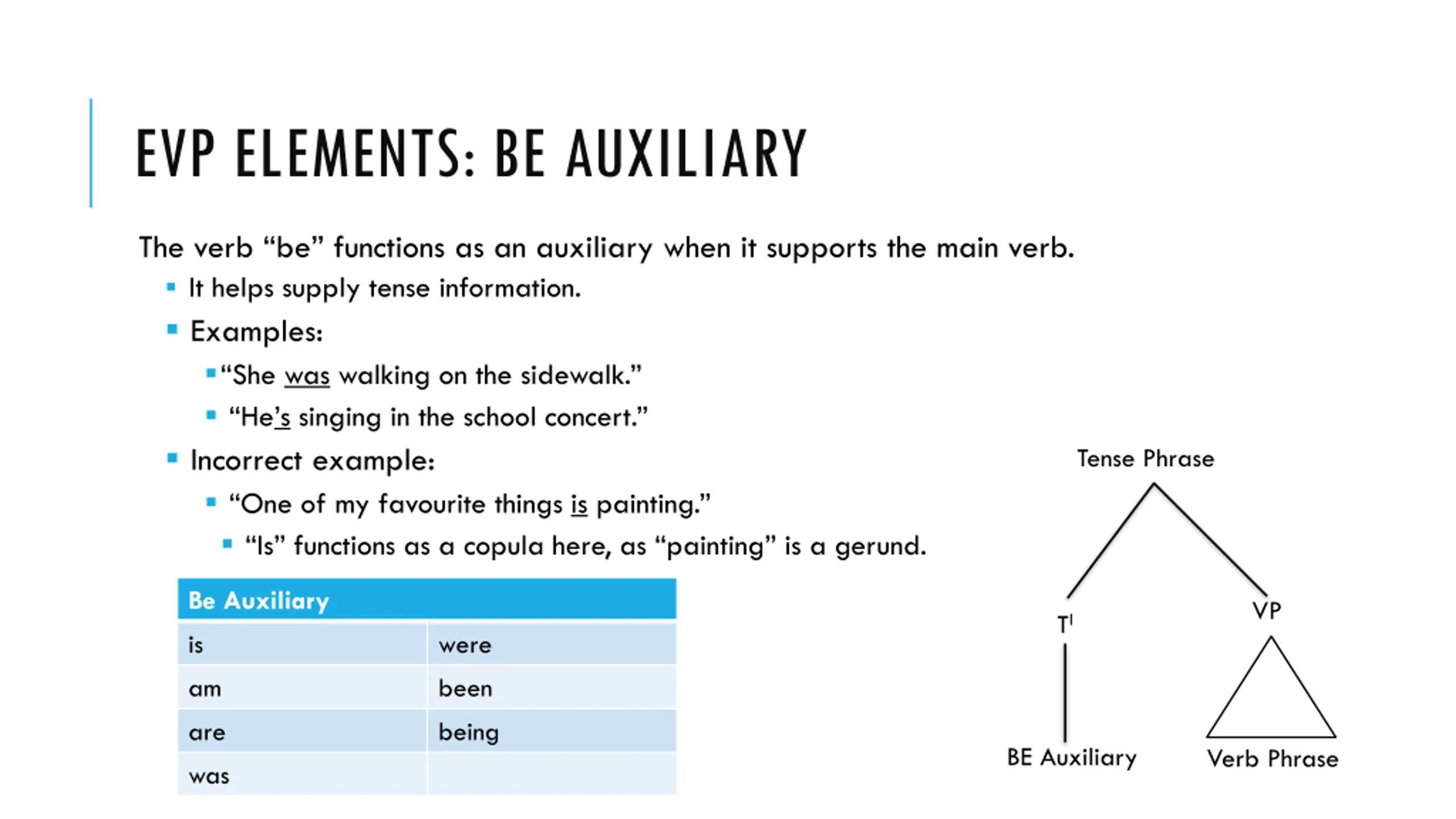 EVP ELEMENTS: BE AUXILIARY The verb be functions as an auxiliary when it supports the main verb. It helps supply tense information. Examples: She was walking on the sidewalk. He ssinging in the school concert. Incorrect example: One of my favourite things is painting. Is functions as a copula here, as painting is a gerund. Tense Phrase Be Auxiliary VP TI is were am been are being BE Auxiliary Verb Phrase was