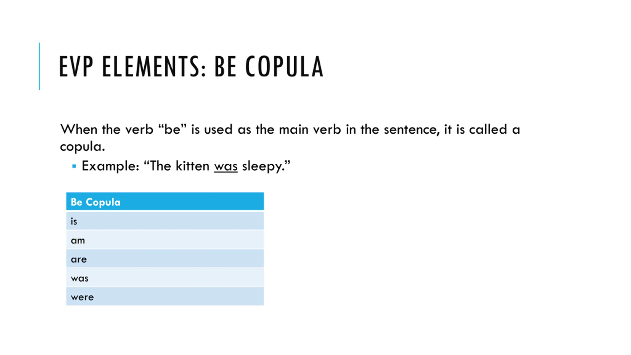 EVP ELEMENTS: BE COPULA When the verb be is used as the main verb in the sentence, it is called a copula. Example: The kitten was sleepy. Be Copula is am are was were