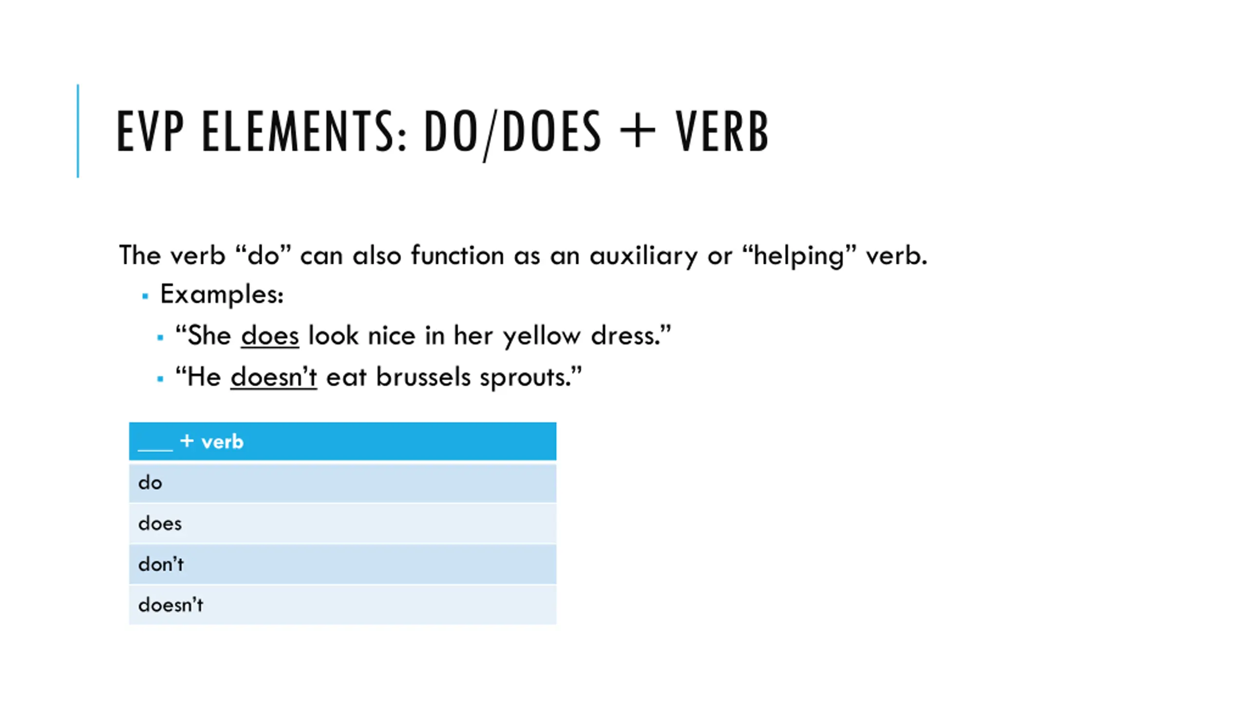 EVP ELEMENTS: DO/DOES + VERB The verb do can also function as an auxiliary or helping verb. Examples: She does look nice in her yellow dress. He doesn teat brussels sprouts. ___ + verb do does don t doesn t